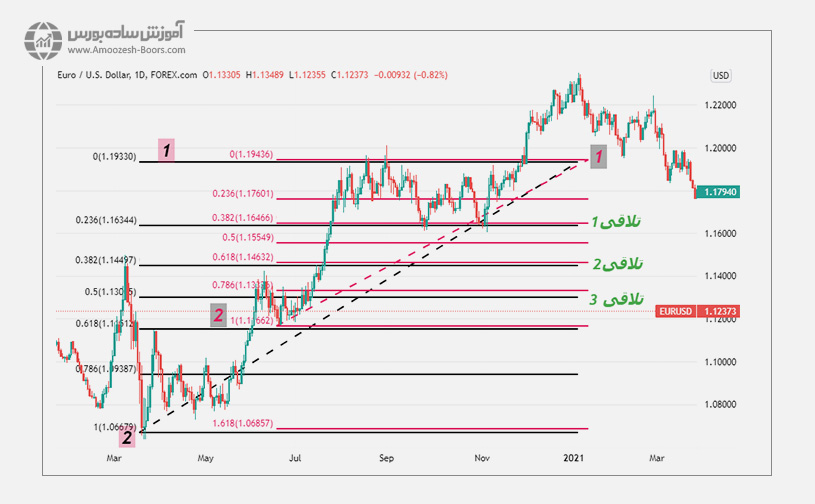 تلاقی فیبوناچی زمانی اتفاق می افتد که دو یا چند فیبوناچی نقاط یکسانی برای بازگشت روند به ما نشان دهد و به دوصورت میتوان از تلاقی استفاده کرد.