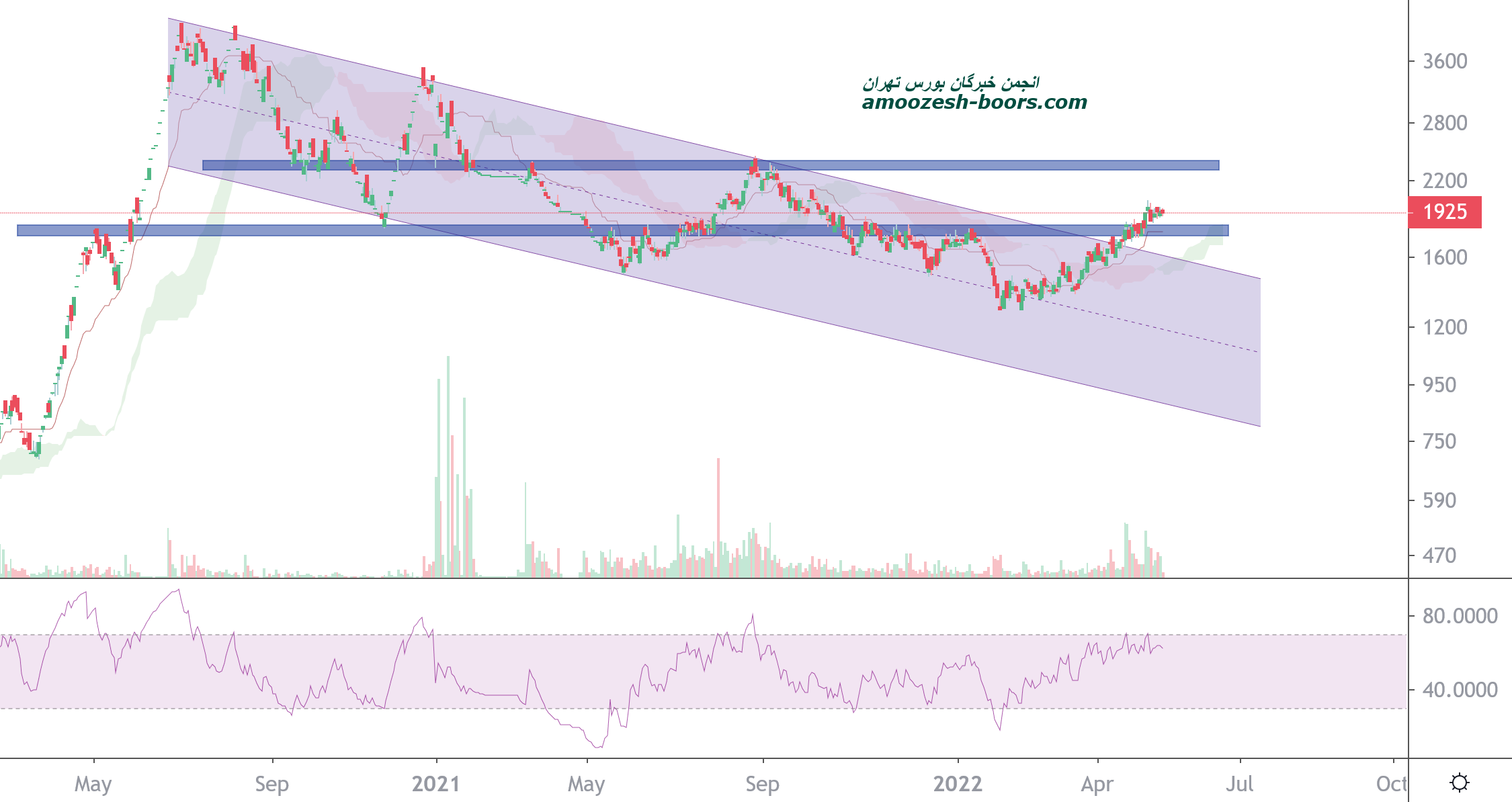 قیمت بعد از افزایش تقاضا موفق به شکست دو مقاومت سقف کانال و محدوده استاتیک شده است و در حال تثبیت بالای این محدوده میباشد در صورت ادامه فشار تقاضا حرکت قیمت تا 2400 ریال محتمل میباشد و در صورتی که سهم وارد فاز اصلاحی شود اولین و دومین حمایت سهم به ترتیب 1800 و 1500 ریال در نظر گرفته خواهد شد که در صورت از دست رفتن حمایت اول حد ضرر دوستان کوتاه مدتی فعال خواهد شد.