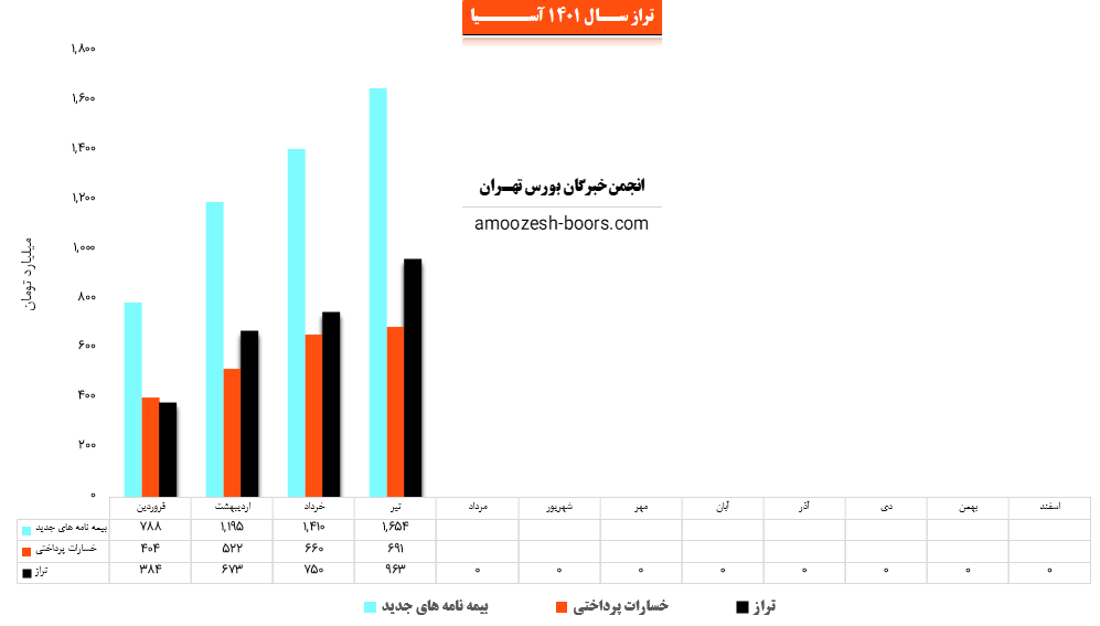 همچنین سهم آسیا در تیر ماه مبلغ 691 میلیارد تومان به بیمه نامه های خود خسارت پرداخت کرده که این میزان با افزایش 5درصدی نسبت به ماه گذشته روبرو شده و لذا با توجه به افزایش بیشتر درآمد شرکت از محل بیمه نامه های جدید تراز آسیا با ۲۸ % افزایش در مقایسه با ماه گذشته به 963 میلیارد تومان رسیده است.