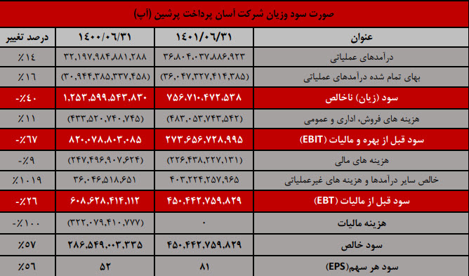 مطابق با گزارش صورت مالی میان دوره ای 6 ماهه آپ به ازای هر سهم 81 ریال سود محقق شده است که نسبت به دوره مشابه سال قبل (56%) افزایش داشته است. سود ناخالص 40% افت، سود عملیاتی 67% افت، درآمدهای عملیاتی 14% رشد و هزینه های مالی9% افت داشته است.حاشیه سود ناخالص شرکت در دوره 6 ماهه 1401، 2.1 درصد گزارش شده است که این عدد در 6 ماهه سال 1400 حدود 3.9 درصد بوده است.درآمد کلی نماد آپ (شرکت آسان پرداخت پرشین) حدودا با رشد 14 درصدی در شش ماهه نخست 1401 نسبت به مقطع مشابه سال قبل همراه بوده است که این رشد عمدتا ناشی از افزایش2 درصدی درآمد کارمزد شاپرکی و افزایش 38 درصدی سایر درآمدهای عملیاتی شرکت می باشد