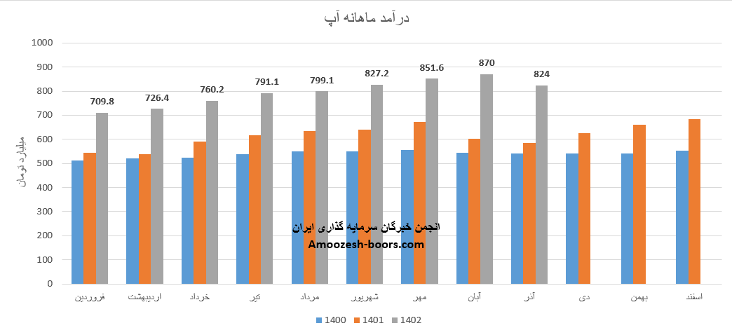 فروش آذر ماه سال 1402 سهم آپ 824 میلیارد تومان گزارش شده است، تغییرات درآمدی آپ به شرح زیر میباشد: