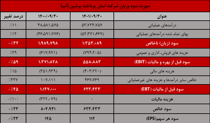 شرکت آسان پرداخت پرشین با نماد آپ به درآمد 625.5 میلیارد تومانی رسیده که این رقم تغییرات زیر را تجربه نموده است .
