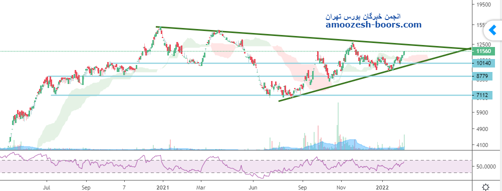 قیمت در جریان حرکت صعودی کوتاه مدت خود مقاومت های 12500 و 14500 را تا تست قله تاریخی خو سر راه خود دارد . همچنین در صورت اصلاح قیمتی ، حمایت 10000 ریال در نظر گرفته خواهد شد .