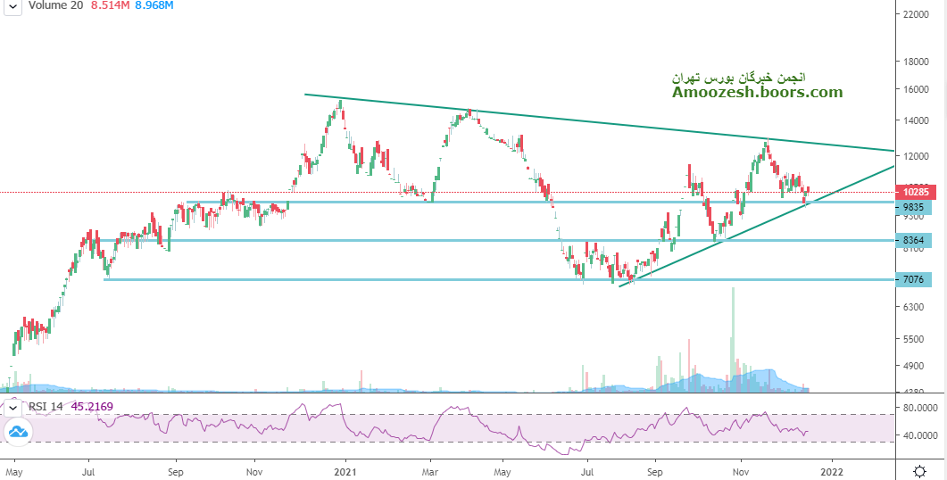 قیمت پس از ایجاد واگرایی منفی با برخورد با سقف مقاومت داینامیک نزولی وارد فاز اصلاحی شده و د رحال حاضر در محدوده پرتراکم حمایتی و تلاقی آن با حمایت روانی هدد رند 10000 ریال واقع شده در صورت تثبیت مثاومت 12500 را سر راه خود داشته در غیر اینصورت اصلاح قیمتی تا 9000 ادامه خواهد داشت.