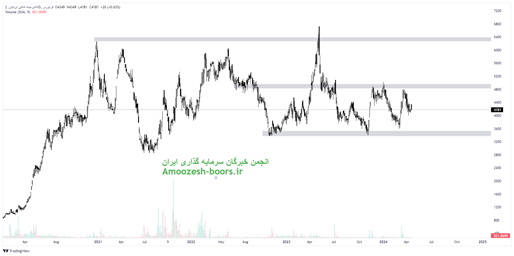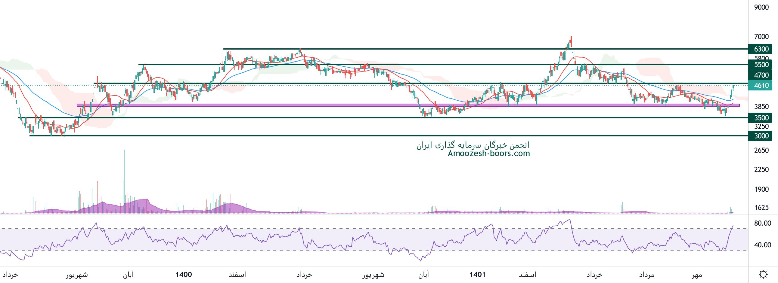 سهم اتکای مقاومت مهم ناحیه ۴۹۰۰ ریال را پیش روی خود دارد که در صورت حفظ تقاضای به وجود آمده در سهم و عبور از این ناحیه، هدف بعدی سهم اتکای در میان مدت ناحیه مهم ۶۴۰۰ ریال در نظر گرفته خواهد شد. همچنین در صورت برگشت مجدد نزدیکترین حمایت به سهم اتکای ناحیه ۳۴۰۰ ریال در نظر گرفته خواهد شد.