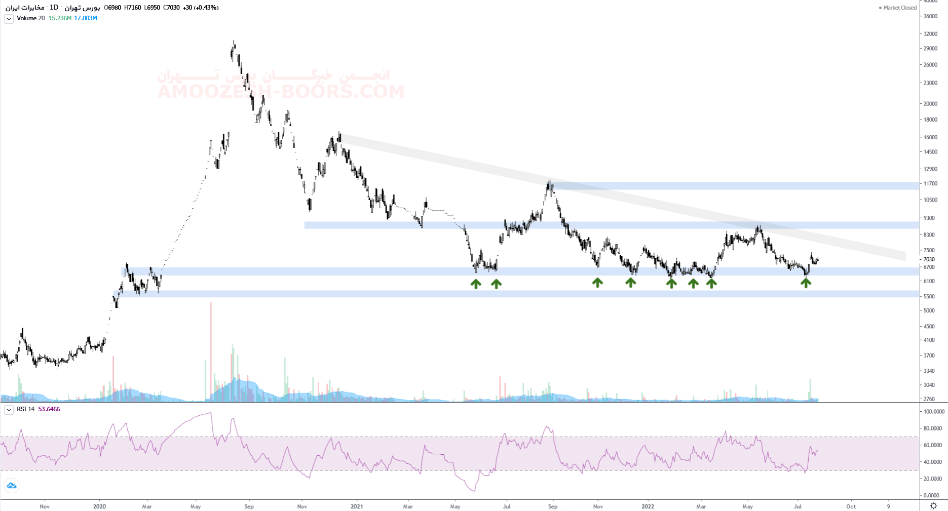قیمت نماد اخابر پس از برخورد ناحیه مقاومتی مهم 890 تومان و با بروز واکنش منفی نسبت به این ناحیه مقاومتی وارد فاز اصلاحی شده و تا ناحیه حمایتی مهم ۶۵۰ تومان اصلاح خود را انجام داده است. همانطور که در تصویر مشاهده می فرمایید این ناحیه حمایتی یک ناحیه حمایتی مستحکم و بسیار مهم برای قیمت به حساب می آید که برای بار هشتم ازقیمت حمایت کرده است. لذا در صورت تداوم رشد و شکست خط روند نزولی قیمت می تواند رشد خود را تا مقاومت مهم ناحیه 890 تومان و درصورت شکست مقاومت ناحیه 1150 تومان ادامه دهد اما در صورت بروز واکنش منفی نسبت به خط روند نزولی قیمت می تواند مجدد این ناحیه حمایتی را تست کند. در صورت از دست رفتن این ناحیه حمایتی مهم قیمت می تواند خود را به ناحیه حمایتی۵۵۰ تومان نیز برساند.