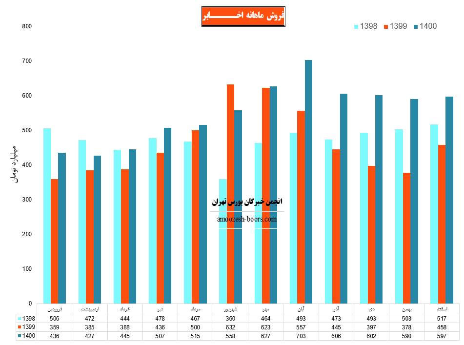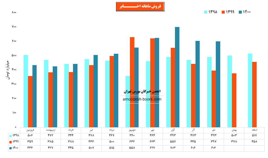 نماد اخابر در انتهای آذر ماه حدود 45 درصد از پیش بینی فروش ۶ ماهه دوم خود را تحقق بخشیده فلذا در خصوص پیش بینی فروش سه ماهه باقیمانده سال1400 مبلغ 2170 میلیارد تومان را به عنوان پیش بینی فروش سه ماه باقیمانده سال اعلام کرده که در مقایسه با فروش محقق شده سه ماهه سوم با 12 درصد رشد در نظر گرفته شده است.