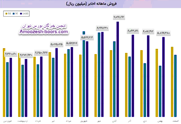 فروش نماد اخابر: 27313 میلیارد تومان که نسبت به دوره مشابه گذشته 22% افزایش یافته است.