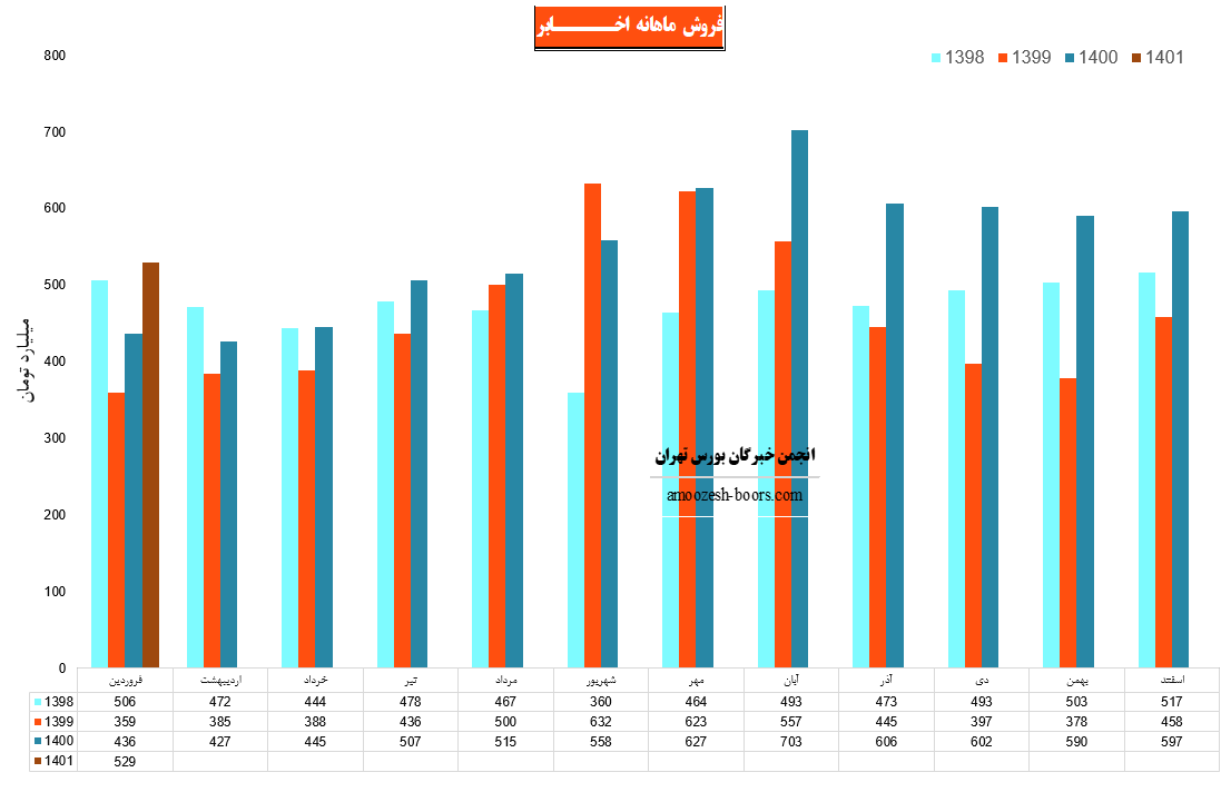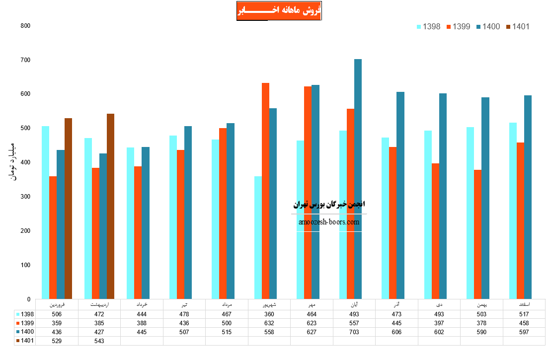 نماد اخابر در فروردین ماه 1401 حدود مبلغ 529 میلیارد تومان درآمد داشته که این میزان در مقایسه با ماه گذشته 11% کاهش و همچنین در مقایسه با مدت مشابه سال گذشته 21% رشد درآمد پیدا کرده است.