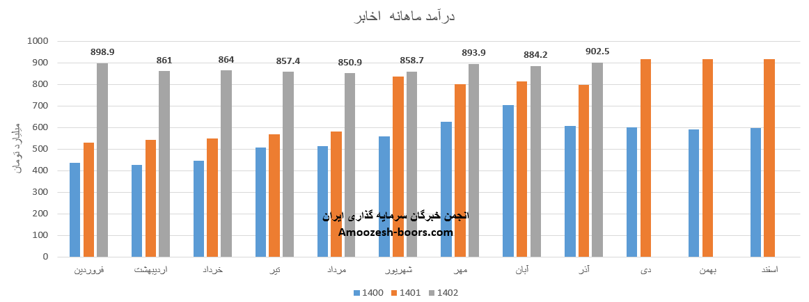فروش آذر ماه سال 1402 سهم اخابر 902.5 میلیارد تومان گزارش شده است، تغییرات درآمدی اخابر به شرح زیر میباشد: