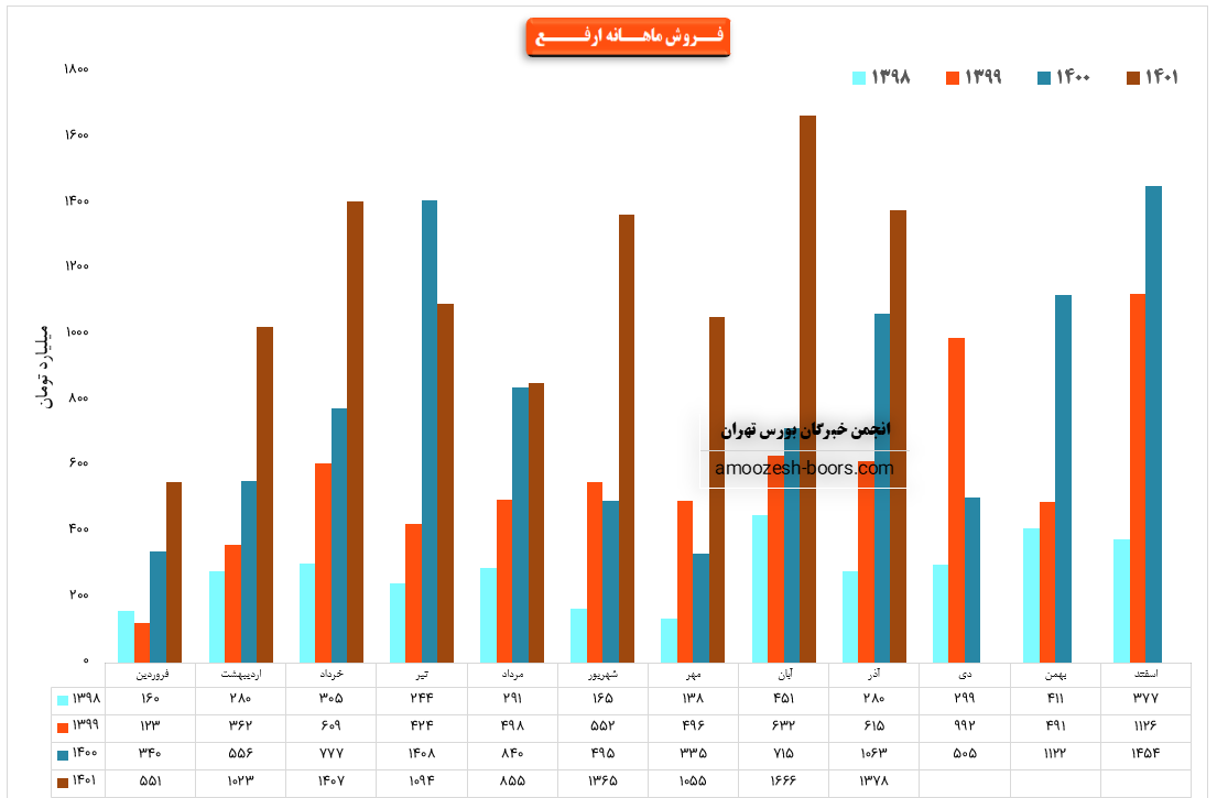 نماد ارفع (شرکت آهن و فولاد ارفع) در آذر ماه ۱۴۰1 حدود مبلغ 1378 میلیارد تومان درآمد داشته که این میزان در مقایسه با ماه گذشته 17% کاهش و همچنین در مقایسه با مدت مشابه سال گذشته 30% رشد درآمد پیدا کرده است.