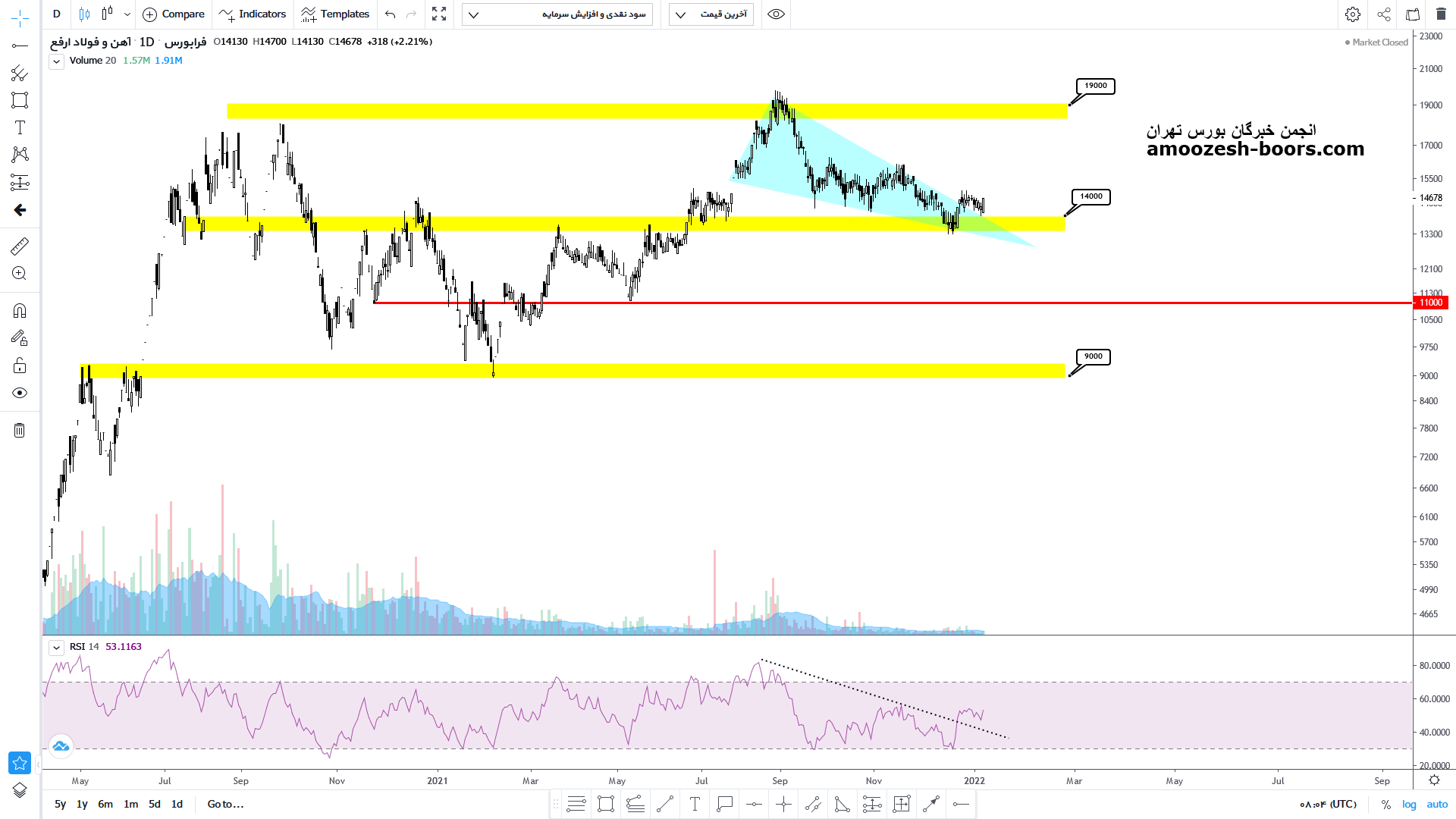 اما درصورت عدم حمایت و شکست محدوده حمایتی 1400 نزول بیشتر تا محدوده بعدی یعنی محدوده پر تراکم حمایتی 900 الی 1100 ادامه خواهد داشت.