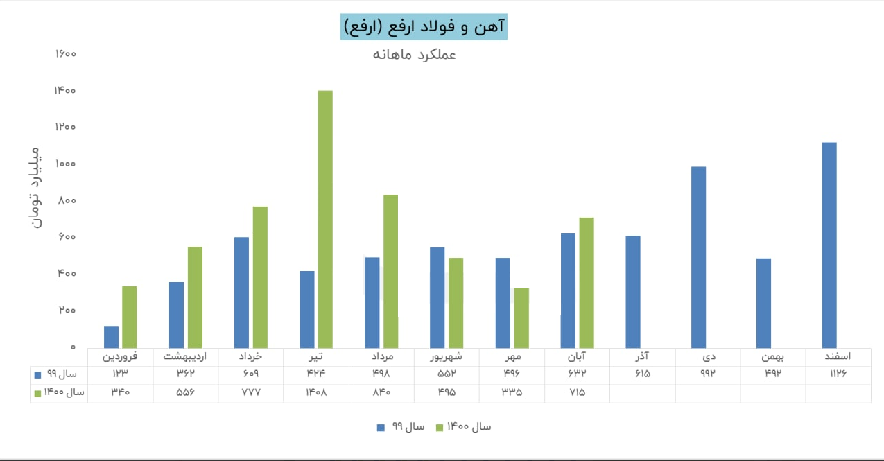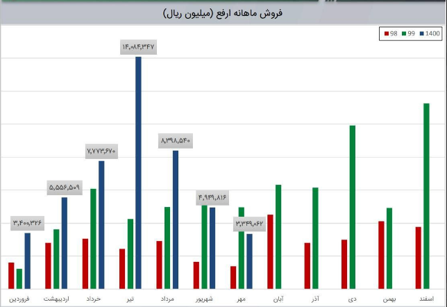 شرکت آهن و فولاد ارفع طی عملکرد 1 ماهه منتهی به 1400/09/30 معادل 10,627,806 میلیون ریال از محصولات خود را به فروش رسانده که نسبت به دوره 1 ماهه مشابه سال قبل 73% افزایش داشته است. مقدار فروش شمش فولادی ارفع در ماه آذر با رشد 50 درصدی نسبت به ماه آبان به 77 هزار تن رسید. نرخ فروش این محصول در آذر ماه برابر با 13.7 میلیون تومان در هر تن گزارش شده است که 2 درصد کمتر از ماه گذشته می باشد.