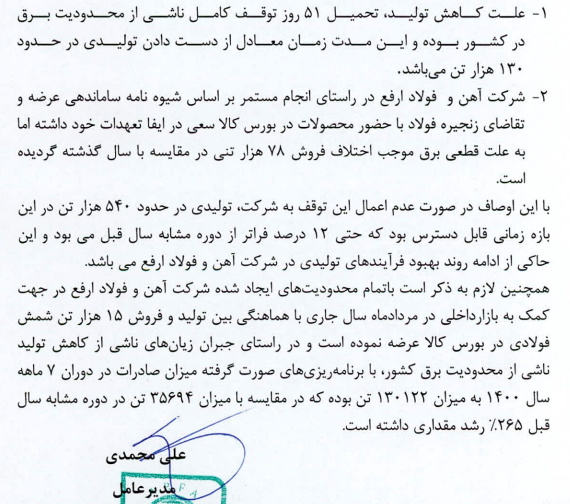 در ۳ ماه دوم سال ۱۴۰۰ (فصل تابستان) به دلیل قطع برق شرکتهای فولادی که شامل این شرکت نیز می شود ، طبق پیش بینی ها این موضوع باعث کاهش تولید و همچنین فروش محصولات شرکت شده است. در ضمن با توجه به محدودیت های استفاده از حامل های انرژی(گاز مصرفی) در پایان سال پیش بینی می شود با کاهش تولید محصولات شرکت و در نهایت کاهش فروش محصولات شرکت روبه رو شویم. این موضوعات در پیش بینی سه ماه اول سال ۱۴۰۰ درنظر گرفته نشده بود و این محدودیت ها به یکباره از طرف دولت اعمال شده است.