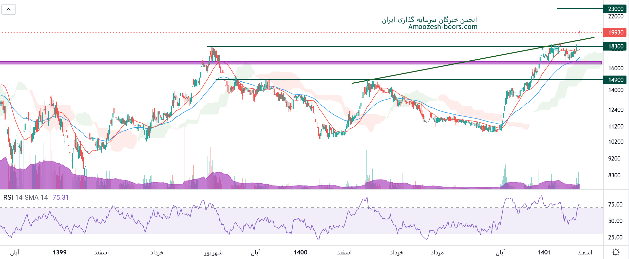 نماد ارفع با حجم تقاضای بالا موفق به شکست خط روند صعودی خود شده، در صورت ادامه دار شدن حجم تقاضا، حرکت سهم ارفع تا 23000 ریال دور از ذهن نخواهد بود، همچنین در صورت اصلاح، حمایت های 19000 و 18300 ریال را دارا میباشد.