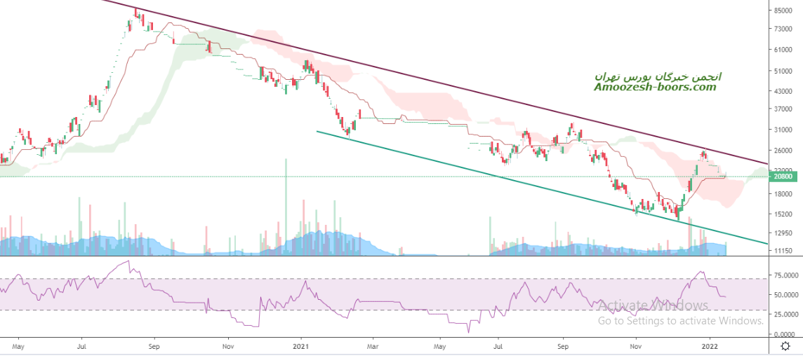 سهم با ایجاد واگرایی منفی و برخورد به سقف کانال نزولی وارد فاز اصلاحی شده و در حال حاضر حمایت مووینگ ماهانه و عدد رند 20000 ریال را حفظ نموده در صورت ایجاد فشار فروش ، اولین سطح حمایتی 14500 و در صورت تثبیت مقاومت 24000 و 27000 ریالبه ترتیب سر راه سهم قرار دارد .