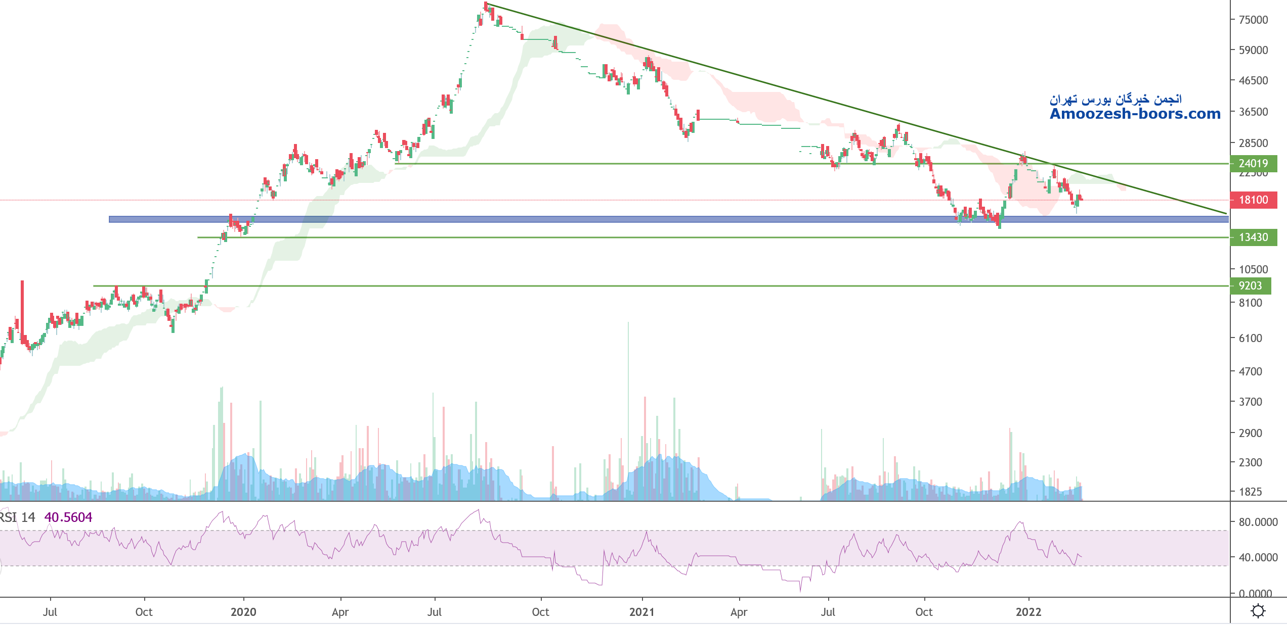 قیمت در حال فشرده شدن بین خط مقاومت داینامیک و حمایت استاتیک خود است و در صورت تثبیت اولین مقاومت سهم 22000 ریال در نظر گرفته خواهد شد و در صورت از دست رفتن حمایت استاتیک اولین حمایت سهم 13500 ریال خواهد بود که حد ضرر سهم فعال میشود.