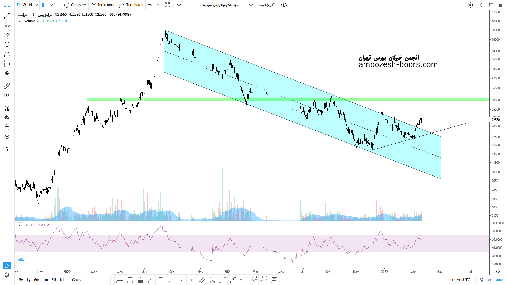 قیمت پس از برخورد به محدوده میانی کانال نزولی درازمدت خود توانسته رشدی را تجربه کند و همچنین طی این رشد قیمت توانسته محدوده مقاومتی سقف کانال نزولی خود را از بین ببرد. قیمت پس از پولبک می تواند تا محدوده مقاومتی ۳۰۰۰ تومان و در صورت شکست این محدوده می تواند تا محدوده ۴۰۰۰ تومان نیز رشد خود را ادامه دهد. اما در صورت برگشت مجدد به ترتیب محدوده های حمایتی ۱۷۰۰ تومان و ۱۴۰۰ تومان را بر سر راه خود خواهد دید.