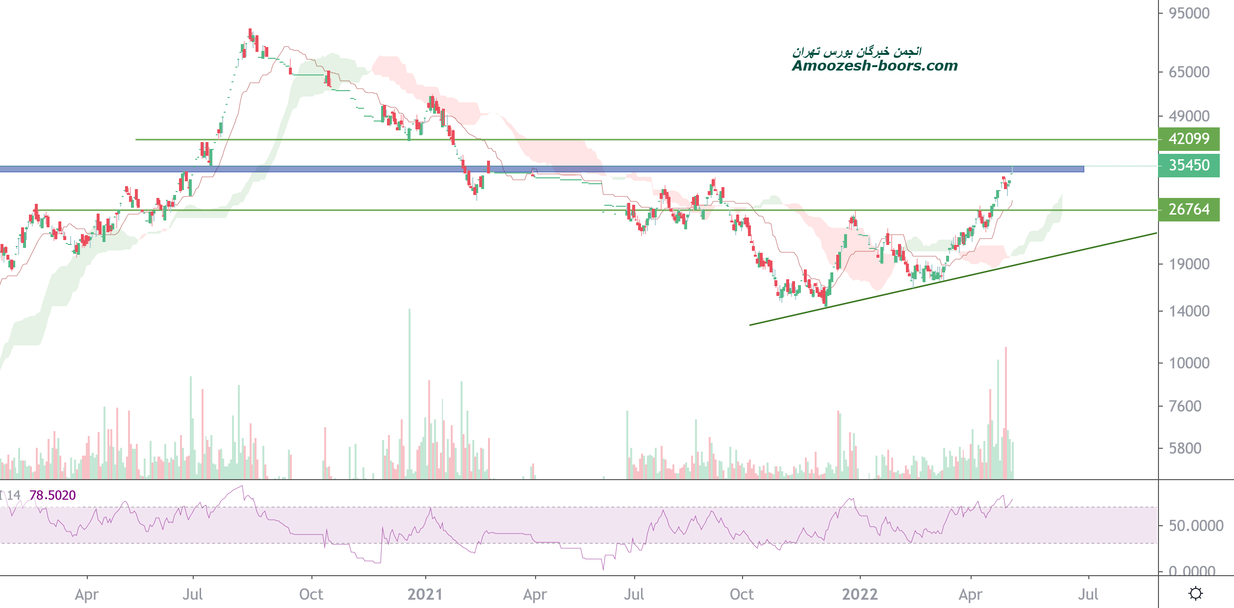 قیمت در حال حاضر درگیر محدوده مقاومتی استاتیک میباشد،در صورت ادامه دار شدن فشار تقاضا و شکسته شدن این محدوده و تثبیت بالای این منطقه حرکت قیمت تا 42000 ریال محتمل خواهد بود و در صوتی که سهم وارد فاز اصلاحی شود اولین حمایت سهم 27000 ریال در نظر گرفته خواهد شد که در این صورت حد ضرر دوستان کوتاه مدتی فعال خواهد شد.