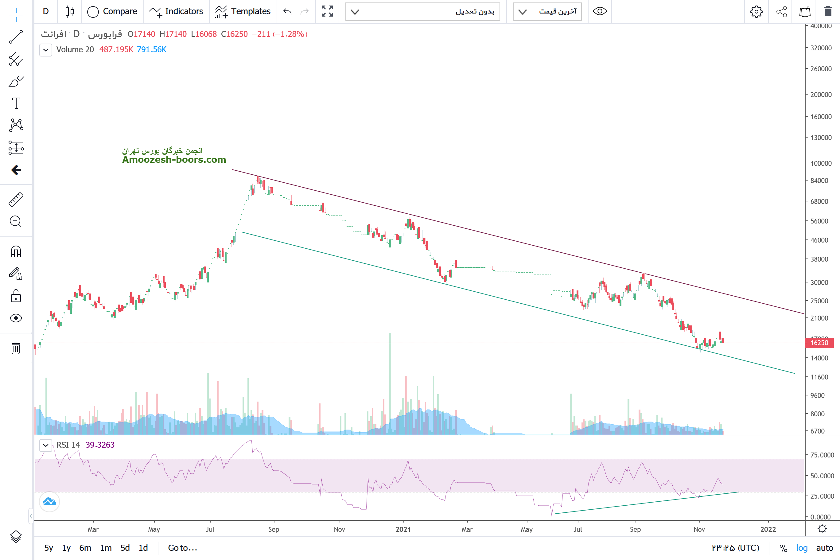 سهم یک واگرایی مثبتی در منطقه کف کانال و اینترمدیت نزولی ایجاد نموده و میتواند نوسان قیمت تا اولین سطح 20000 ایجاد نماید اما مومنتوم حرکت برگشت نوسانی و ضعیف میباشد .و با از دست دادن حمایت 14000 حد ضرر فعال خواهد شد .