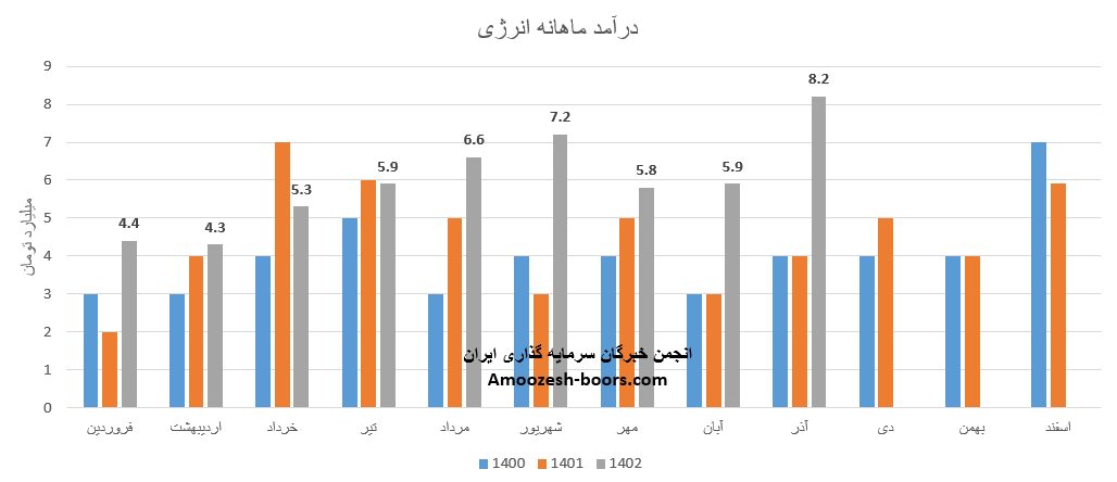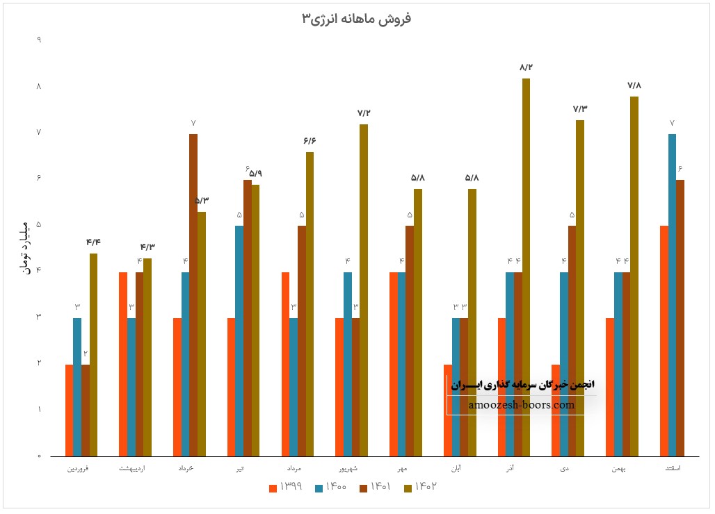 فروش آذر ماه سال 1402 سهم انرژی 8.2 میلیارد تومان گزارش شده است، تغییرات درآمدی انرژی3 به شرح زیر میباشد:
