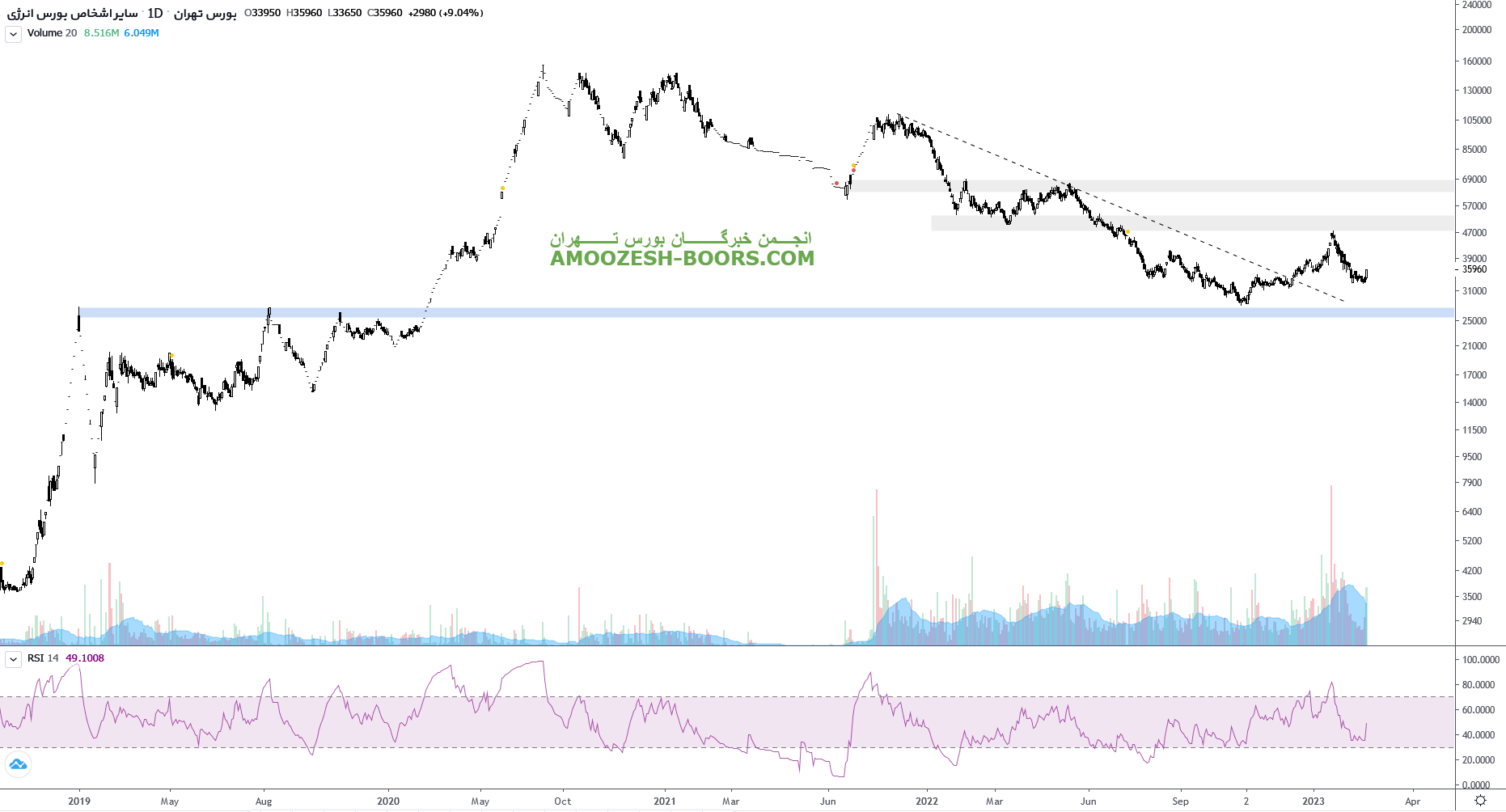 نماد انرژی3 که موفق به شکست محدوده مقاومتی 53500 ریال شده، در حال تثبیت بالای این محدوده میباشد، در صورتی که سهم انرژی3 موفق به تثبیت در این محدوده شود، حرکت سهم تا محدوده 65000 ریال دور از ذهن نخواهد بود، همچنین در صورت از دست رفتن محدوده 53500 ریال، اصلاح قیمت تا 46000 ریال محتمل خواهد بود.