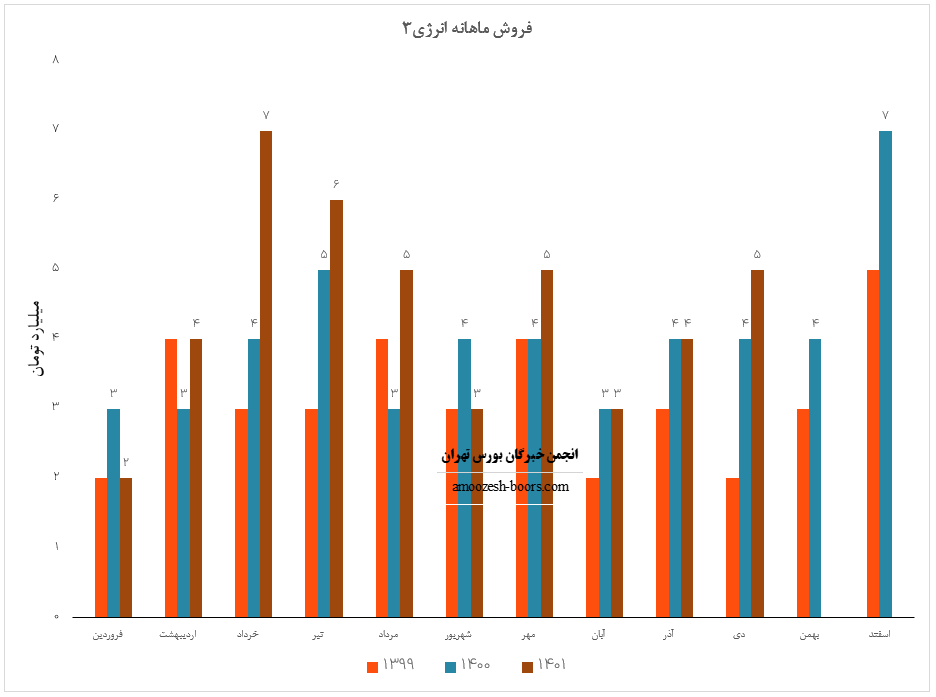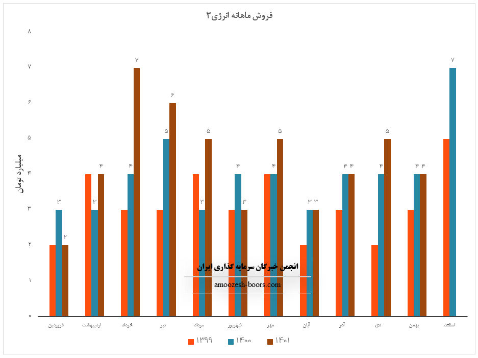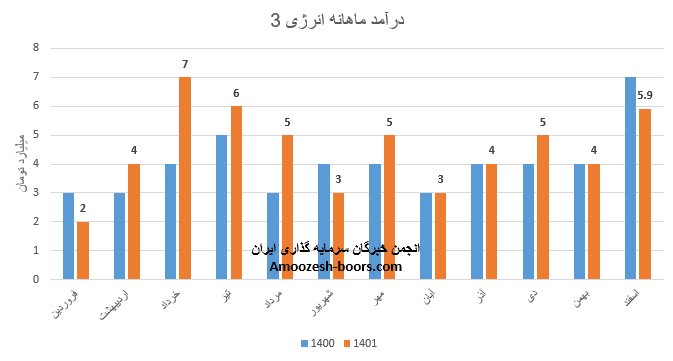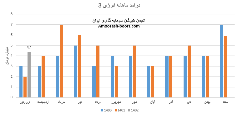 انرژی3 سال مالی خود را با افزایش 120 درصدی درآمد نسبت به مدت مشابه آغاز نمود، درآمد حاصل از عملکرد فروردین ماه سال 1402 نماد انرژی3 معادل 4.4 میلیارد تومان گزارش شده که کاهش 25 درصدی نسبت به ماه قبل داشته است، عمده سود انرژی از طریق کارمزد معاملات محقق میشود که درآمد این محل افت 41 درصدی نسبت به ماه گذشته را دارد.