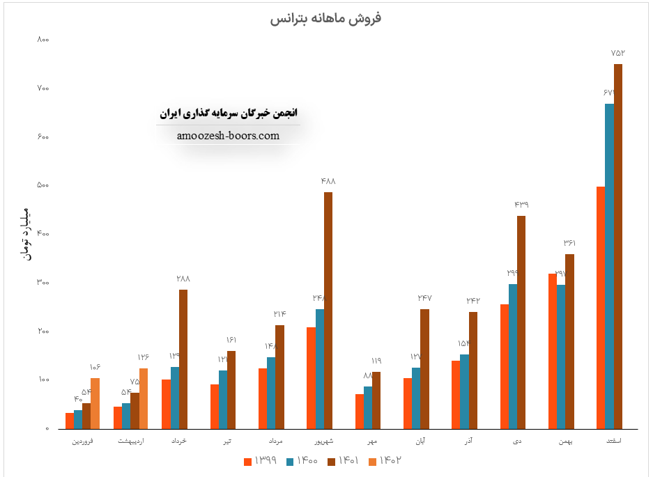 سهم بترانس (شرکت ایران ترانسفو) در اردیبهشت ماه سال ۱۴۰۲ موفق به ثبت فروش 126 میلیارد تومانی شده است. لازم به ذکر است که درآمد این ماه نسبت به ماه گذشته رشد 19 درصدی همچنین و نسبت به مدت مشابه سال گذشته رشد 68 درصدی را تجربه کرده است.
