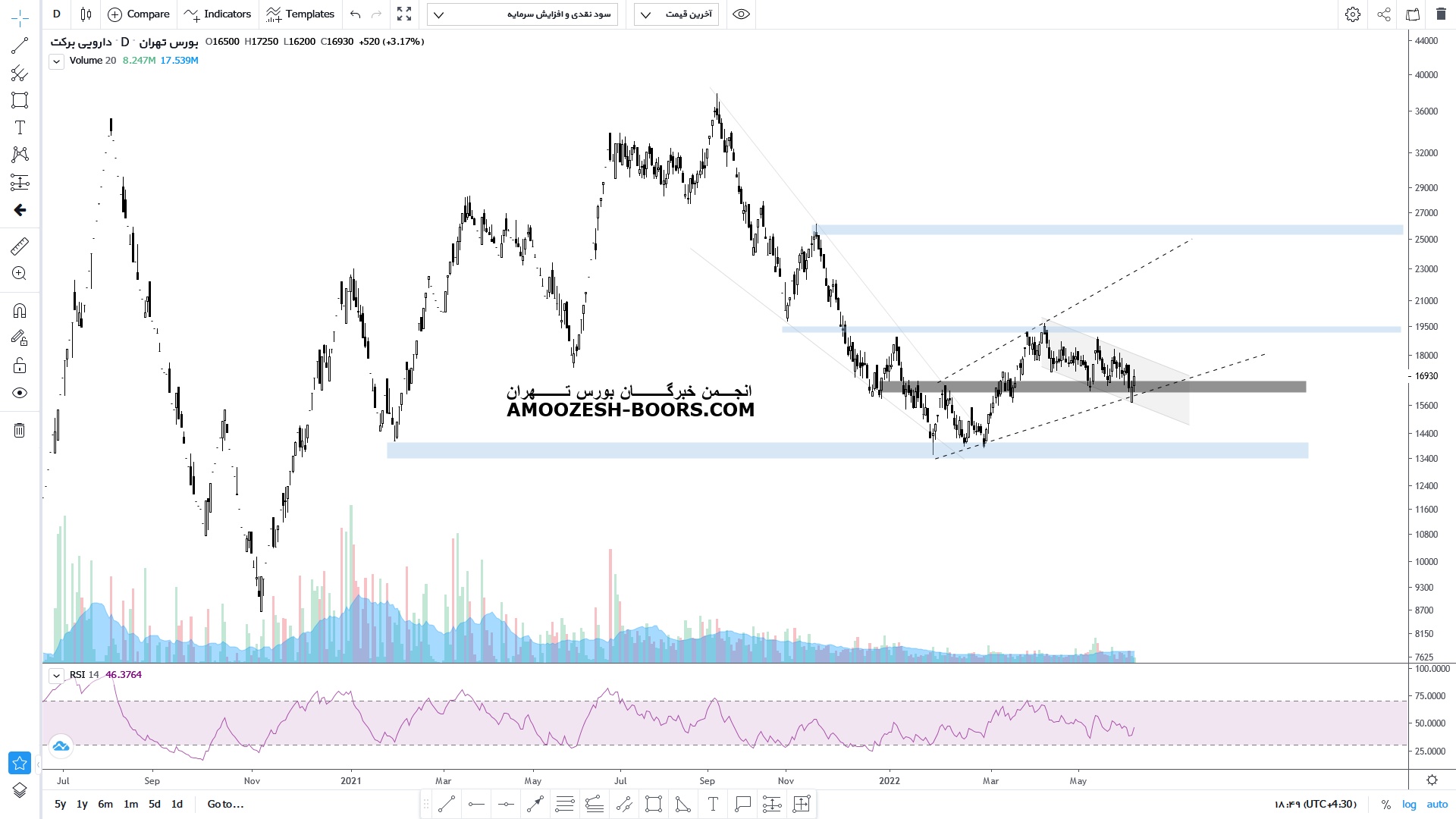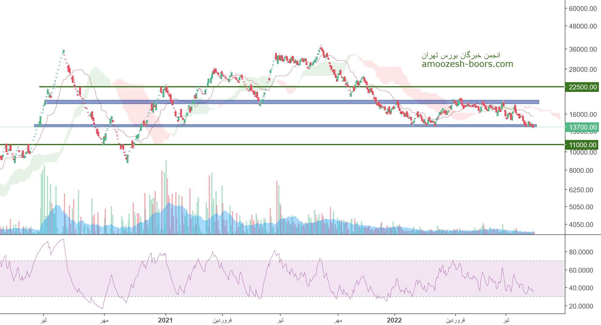 قیمت پس از رشد و خارج شدن ازالگوی فشرده شده با برخورد به مقاومت محدوده 2000 تومان اصلاحی را در غالب یک کانال نزولی آغاز کرده است که اکنون با برخورد به محدوده حمایتی 1600 تومان و همچنینی محدوده کفکانال نزولی خود واکنش مثبتی رااز خود بروز داده است که در صورت رشد میتواند مجدد به سمت مقاومت محدوده 2000 تومان حمله ور شود اما درصورت ریزش مجدد و شکست این محدوده حمایتی مهم و قوی میتواند اصلاح خود را تامحدوده حمایتی 1300 تومان نیز ادامه دهد.