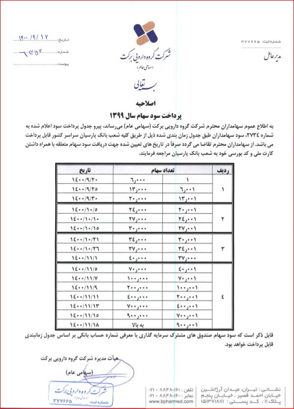 با توجه به انتشار نامه ای توسط شرکت سرمایه گذاری برکت مبنی بر زمانبندی پرداخت سود سهام به سهمداران شرکت، سود کلیه سهامداران شرکت دارویی برکت با توجه به میزان دارایی(طبق تصویر پیوست) از 20 آذر 1400 با مراجعه به کلیه شعب بانک پارسیان قابل دریافت است.