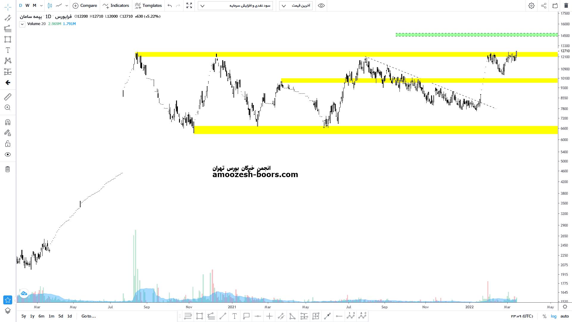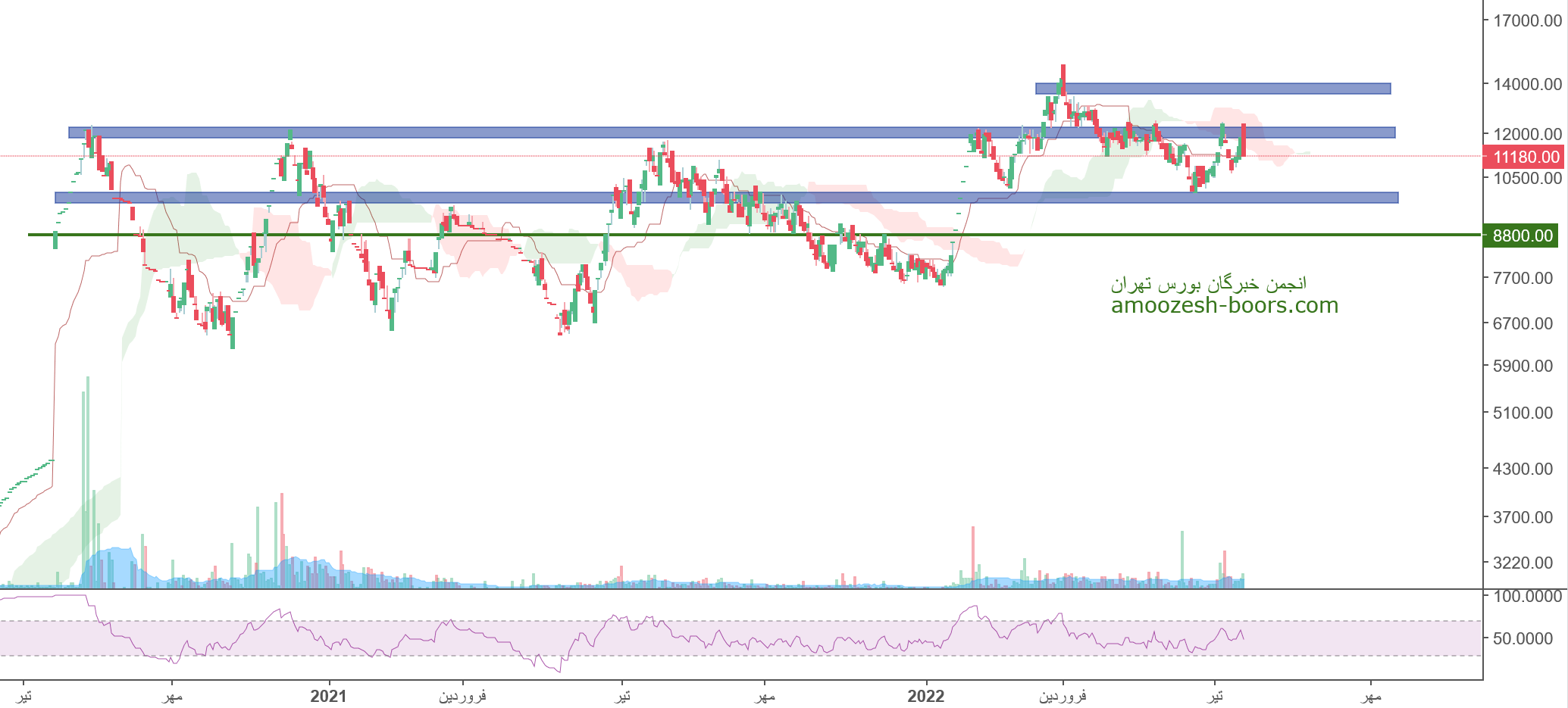 نماد بساما (شرکت بیمه سامان) در حال حاضر مقاومت 12300 ریال را دارا میباشد،در صورت عبور از این مقاومت،حرکت سهم تا 14000 ریال دور از ذهن نخواهد بود، همچنین در صورت اصلاح، حمایت بعدی سهم بساما 9800 ریال در نظر گرفته خواهد شد، که در این صورت حد ضرر فعال میگردد.