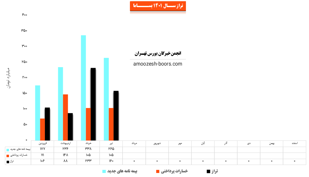 نماد بساما (شرکت بیمه سامان) تیر ماه سال 1401 حدود مبلغ 265 میلیارد تومان بیمه نامه جدید صادر کرده که این میزان در مقایسه با ماه گذشته 22% کاهش پیدا کرده است.