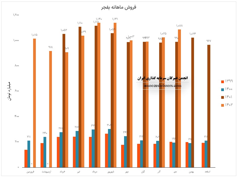 فروش بفجر در این ماه افزایش 36% در مقایسه با ماه گذشته داشته است . همچنین در مقایسه به مدت مشابه 44% و نسبت به متوسط ماهانه 36% افزایش داشته است .