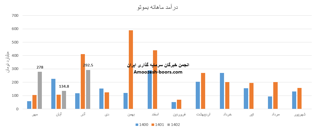 فروش آذر ماه سال 1402 سهم بموتو 292.5 میلیارد تومان گزارش شده است، تغییرات درآمدی بموتو به شرح زیر میباشد: