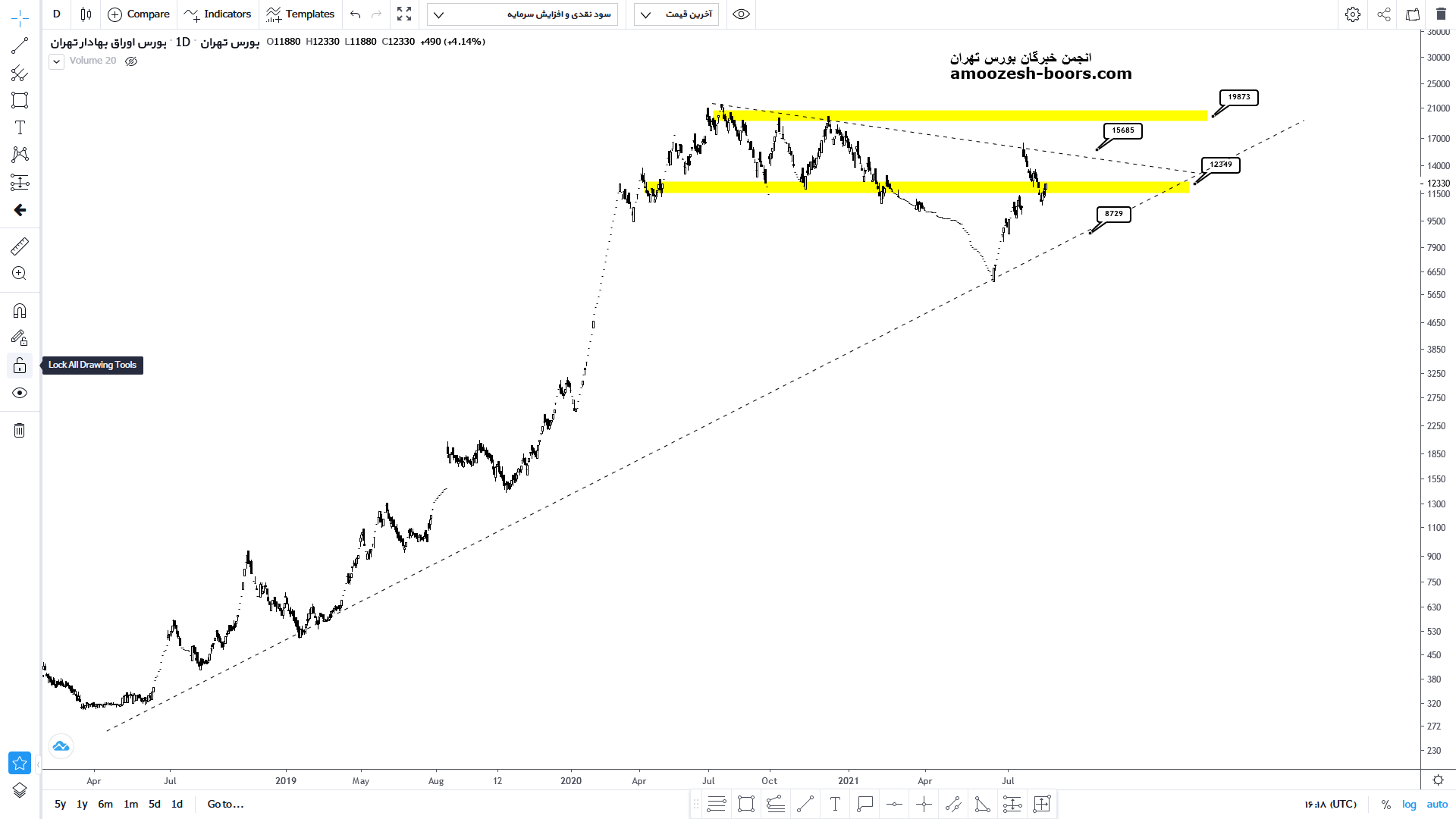 سهم بورس پس از اصلاح قیمتی 70 درصدی از سقف تاریخی خود با برخورد به خط روند صعودی بلند مدت خود واکنش مثبتی از خود نشان داده و مقاومت 1200 تومان خود را شکسته و اکنون این مقاومت را تبدیل به حمایت کرده است درصورت واکنش مثبت به این حمایت انتظار رشد تا محدوده مقاومت 1600 و درصورت از دست رفتن مجدد این حمایت، سیگنال خروج معامله گران کوتاه مدتی فعال شده و انتظاراصلاح بیشتر میرود. همچنین برخورد مجدد به خط روند صعودی بلند مدت خود را در محدوده حمایتی 870 تومان دارا میباشد.