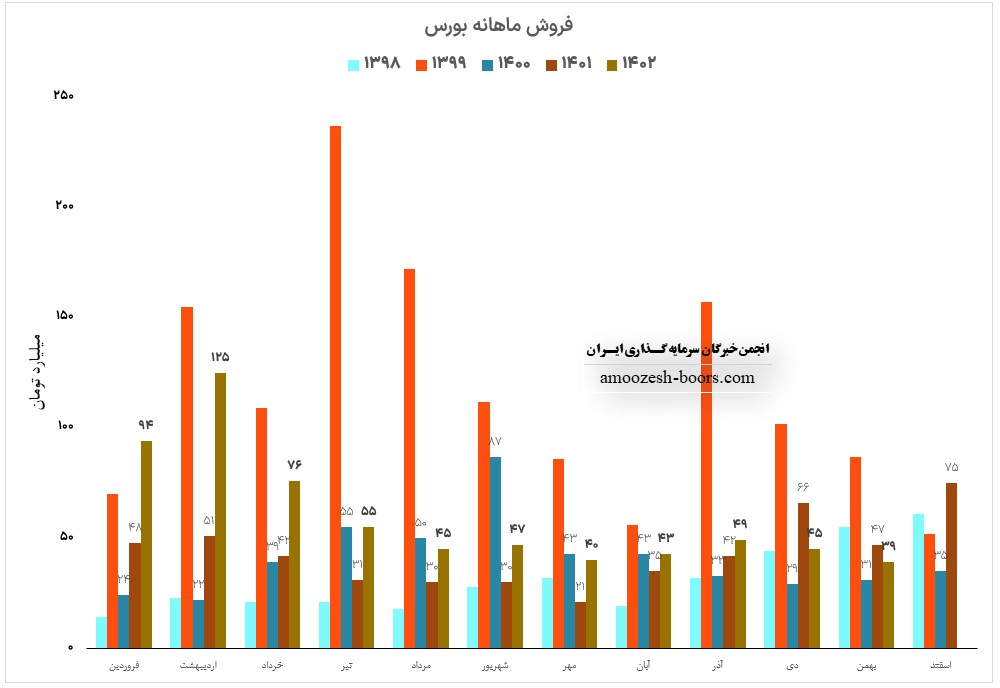 سازمان بورس اوراق بهادار تهران با نماد بورس در این ماه به فروش 33 میلیارد تومانی دست یافت، فروش ماهانه بورس در مقایسه با ماه گذشته 47% کاهش و در مقایسه به فروردین سال گذشته 65% کاهش داشته است.