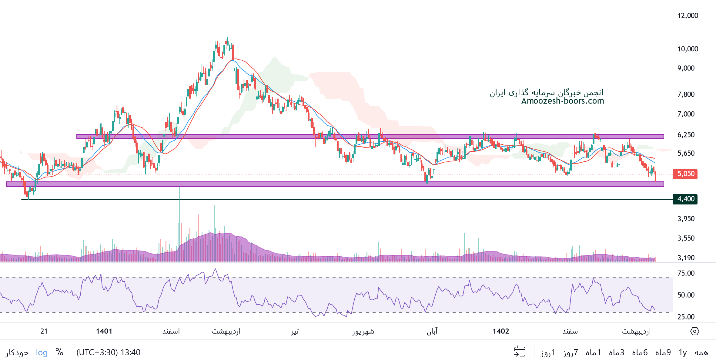 تحلیل تکنیکال سهم بورس نشان میدهد که قیمت در محدوده مقاومتی 5700 ریال و حمایتی 4700 ریال در حال نوسان میباشد، در صورت شکست هر یک از سطوح، مقاومت بعدی سهم بورس 6500 ریال و در صورت ایجاد فشار فروش حمایت بعدی بورس 4400 ریال در نظر گرفته میشوند.