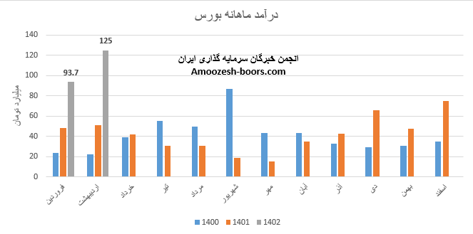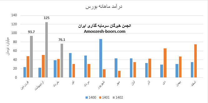 سهم بورس ( بورس تهران ) طی دوره 1 ماهه به درآمد 76.1 میلیارد تومان دست یافته این رقم نسبت به مدت مشابه افزایش 81 درصدی داشته اما نسبت به ماه قبل و متوسط ماهانه به ترتیب با کاهش 39 و 30 درصدی مواجه بوده است، درآمد حاصل از کامزد معاملات در مقایسه با ماه گذشته افت 39 درصدی داشته مجموع درآمد نماد بورس طی عملکرد 3 ماهه از سال مالی نسبت به مدت مشابه افزایش 109 درصدی داشته و طی این مدت 49% از کل درآمد سال گذشته پوشش داده شده است.