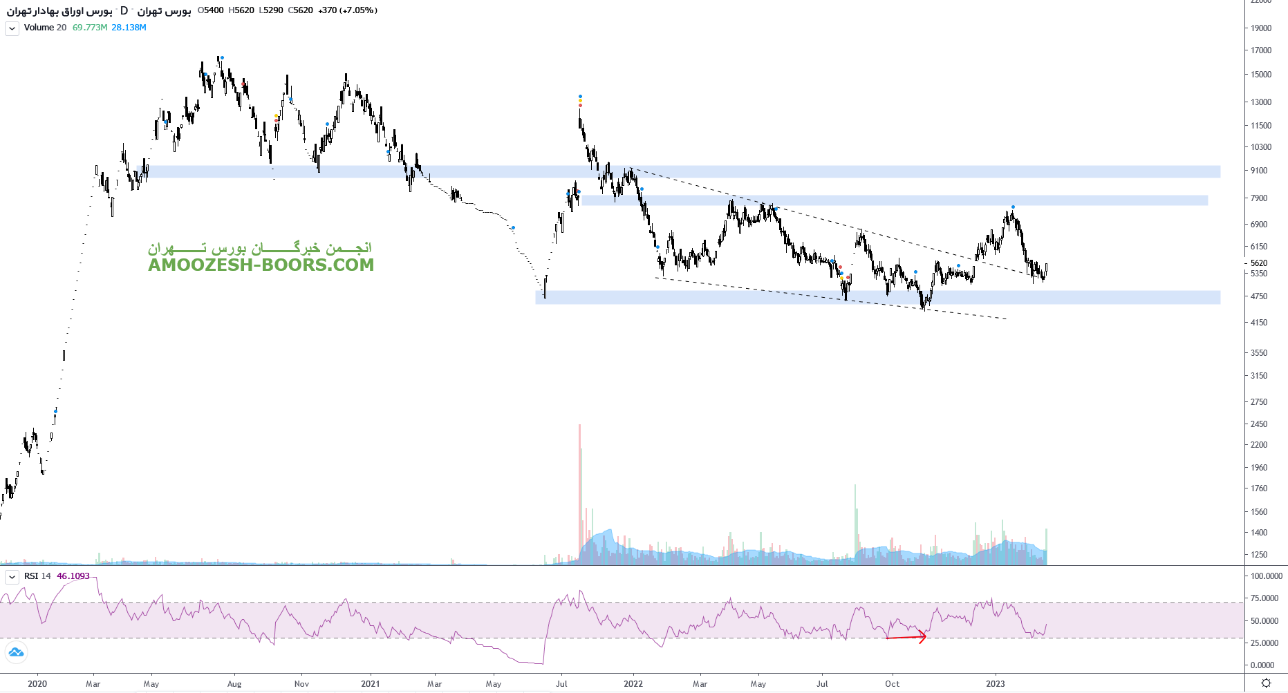 سهم بورس پس از بروز واکنش منفی نسبت به مقاومت ناحیه 780 تومان وارد اصلاح شده و اکنون به حمایت ناحیه ۵۲۰ تومان واکنش مثبت نشان داده است. لذا اولین مقاومت سهم بورس ناحیه سقف ۷۸۰ تومان در نظر گرفته شده است که میتواند با عبور از آن رشد خود را تا مقاومت مهم ناحیه ۹۱۰ تومان نیز ادامه دهد. همچنین در صورت اصلاح بیشتر حمایت اصلی سهم بورس کف ناحیه ۴۶۰ تومان تعیین شده است.