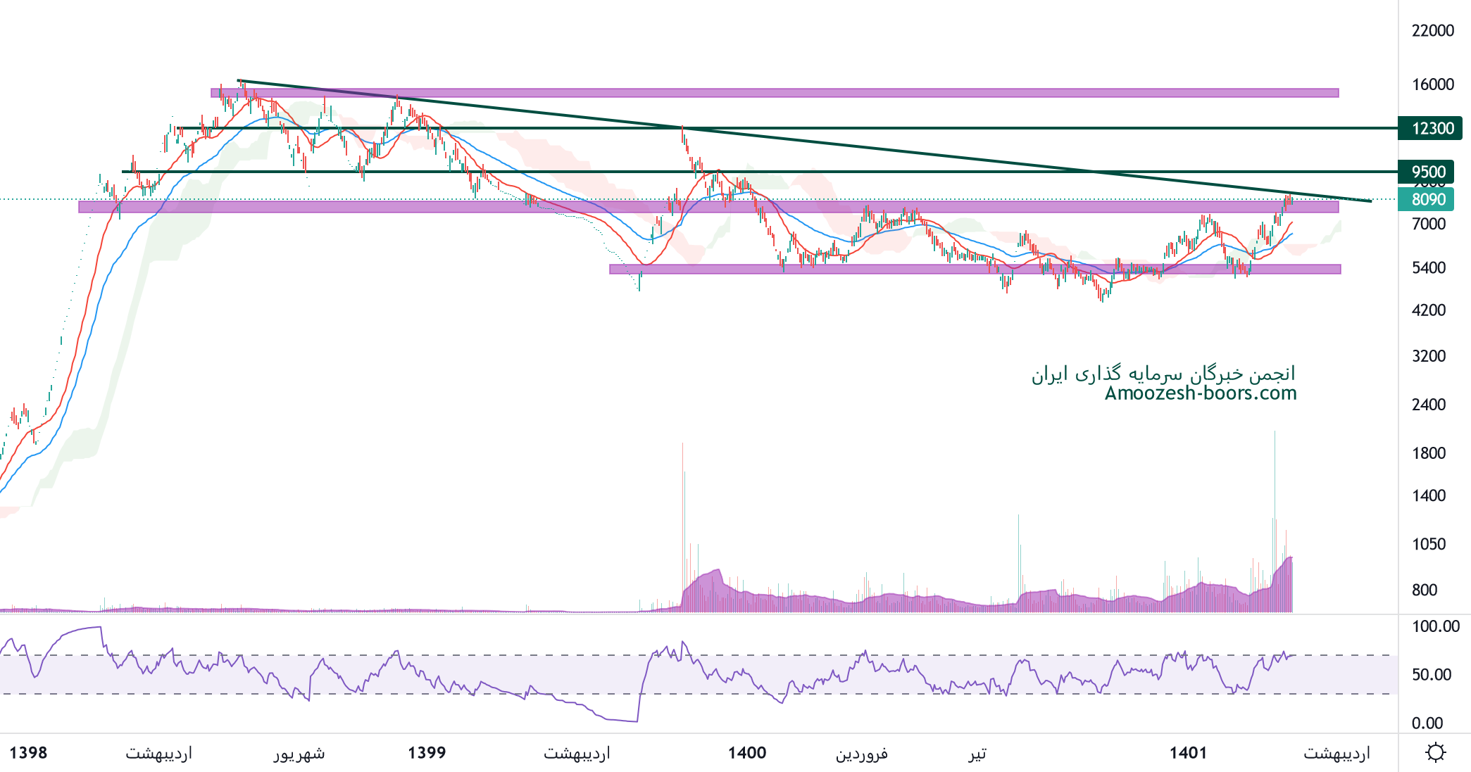 نماد بورس در حال حاضر درگیر محدوده پر ریسک مقاومتی 8200 ریال میباشد، در صورت ادامه دار شدن روند صعودی سهم بورس و عبور از این سطح مقاومتی، حرکت این نماد تا 9500 ریال و بعد از آن 12300 ریال محتمل خواهد بود، همچنین در صورت ورود سهم به فاز اصلاحی، اولین حمایت 6000 ریال در نظر گرفته خواهد شد.
