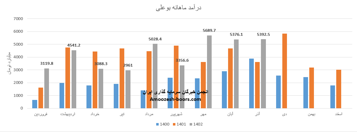 درآمد ماهانه نماد بوعلی نسبت به ماه گذشته 6% رشد، نسبت به متوسط ماهانه 33% رشد و نسبت به مدت مشابه 2% افت را تجربه نموده است.