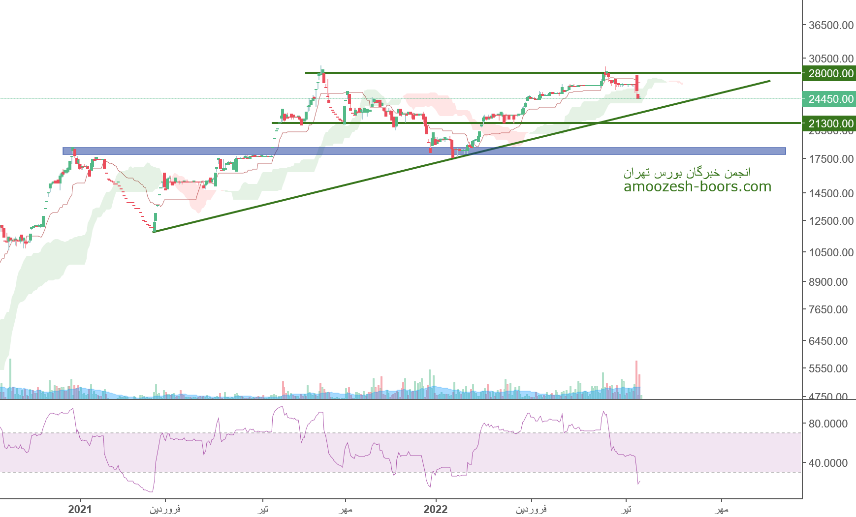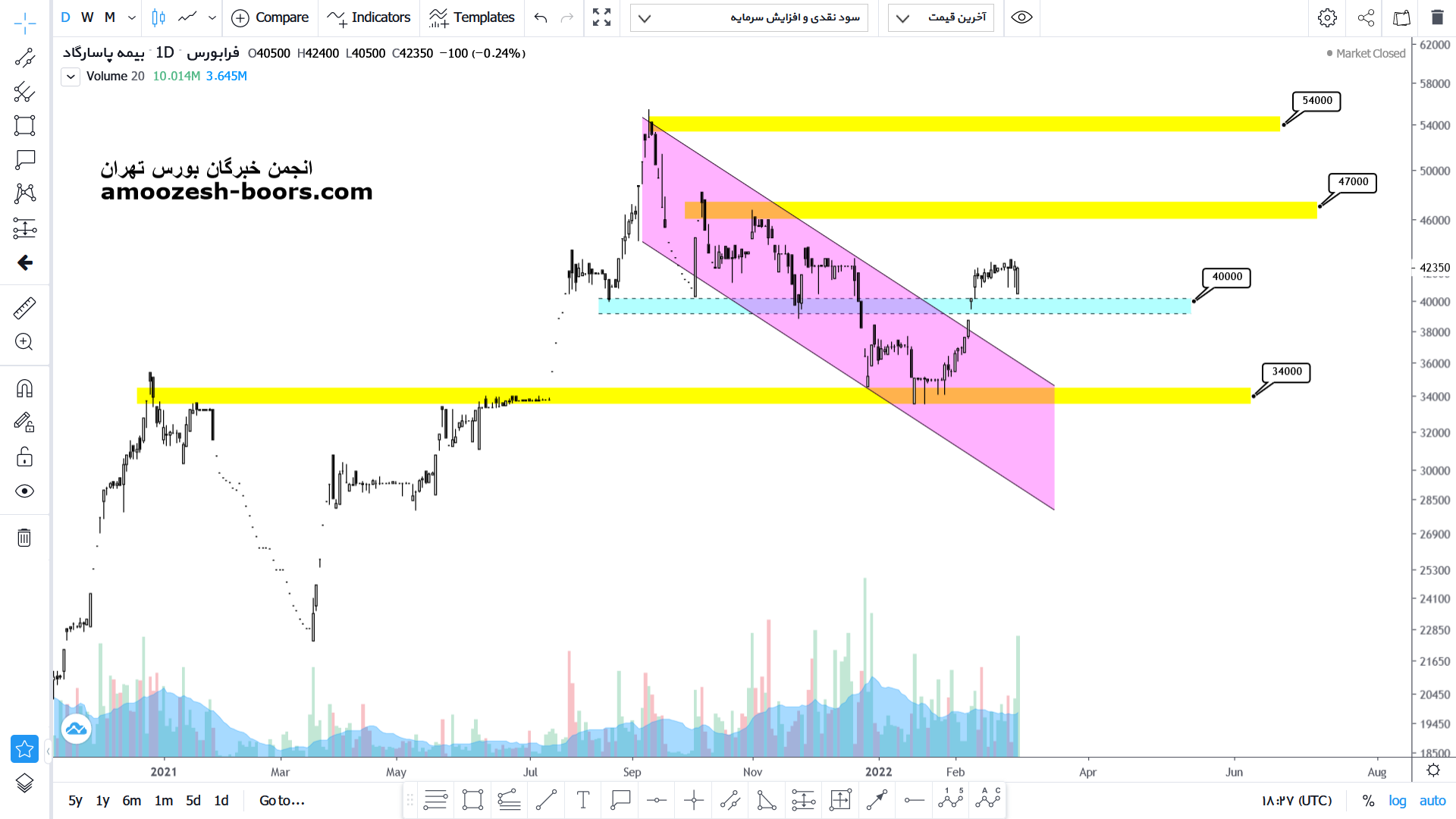 قیمت پس از شکست کانال نزولی اصلاحی و تثبیت بر روی مقاومت شکسته شده محدوده ۴۰۰۰ تومان پولبکی به این محدوده زده است که در صورت تایید پولبک می تواند تا محدوده ۴۷۰۰ تومان نیز صعود خود را ادامه دهد. اما در صورت برگشت مجدد به زیر محدوده ۴۰۰۰ تومان، این ریزش تا محدوده ۳۵۰۰ تومان نیز می تواند ادامه داشته باشد.