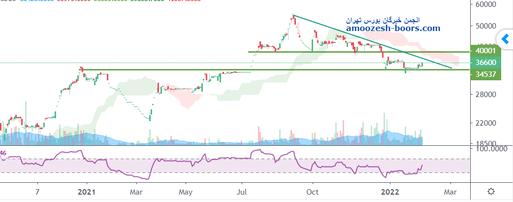 قیمت در محدوده حمایت مقاومتی محصور گردیده است مقاومت 37 و 40 هزار ریال بر سر راه صعودی سهم قرار دارد و در صورت از بین رفتن حمایت 33500 حمایت بعدی 3000 ریال در نظر گرفته خواه شد .