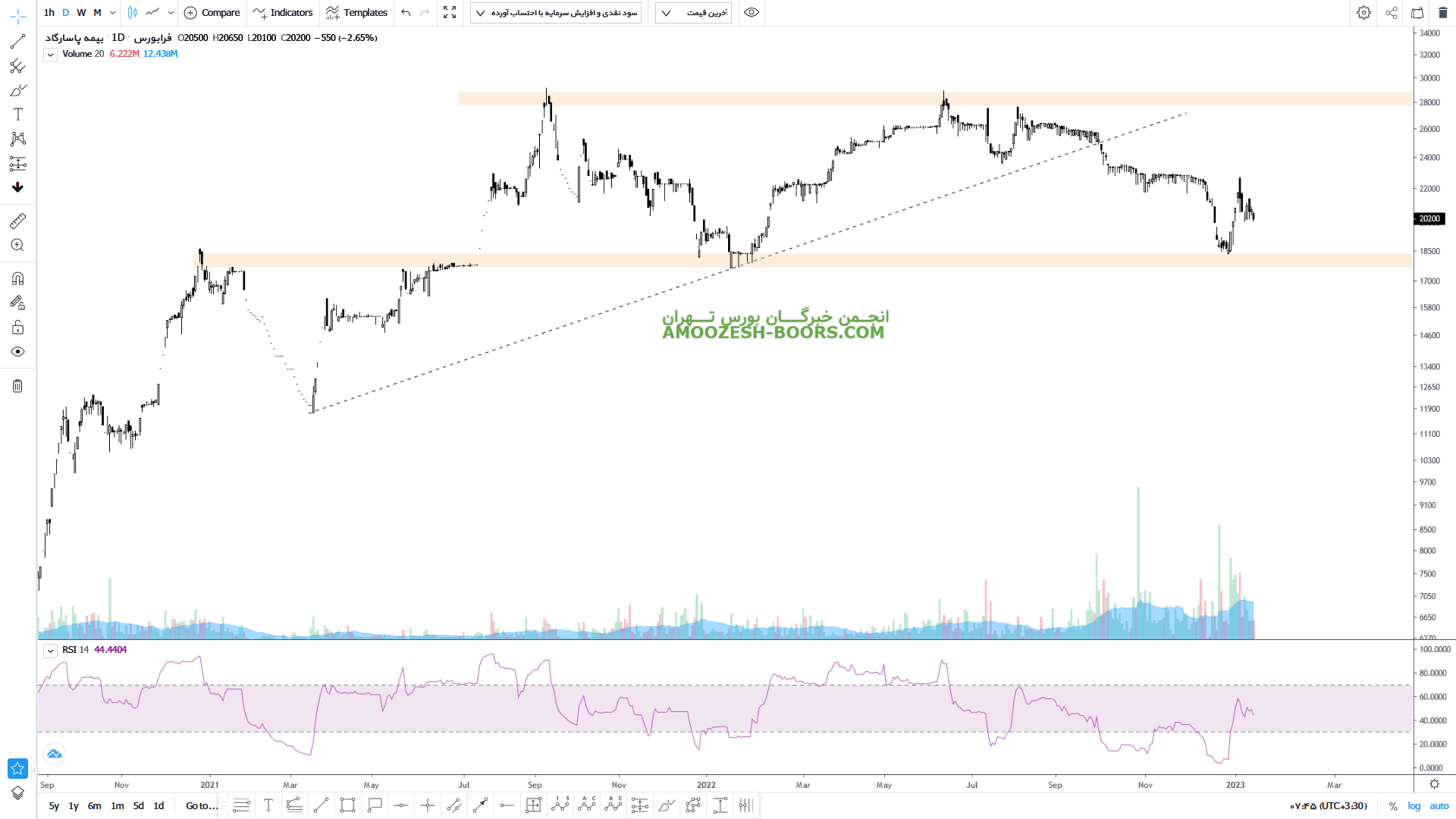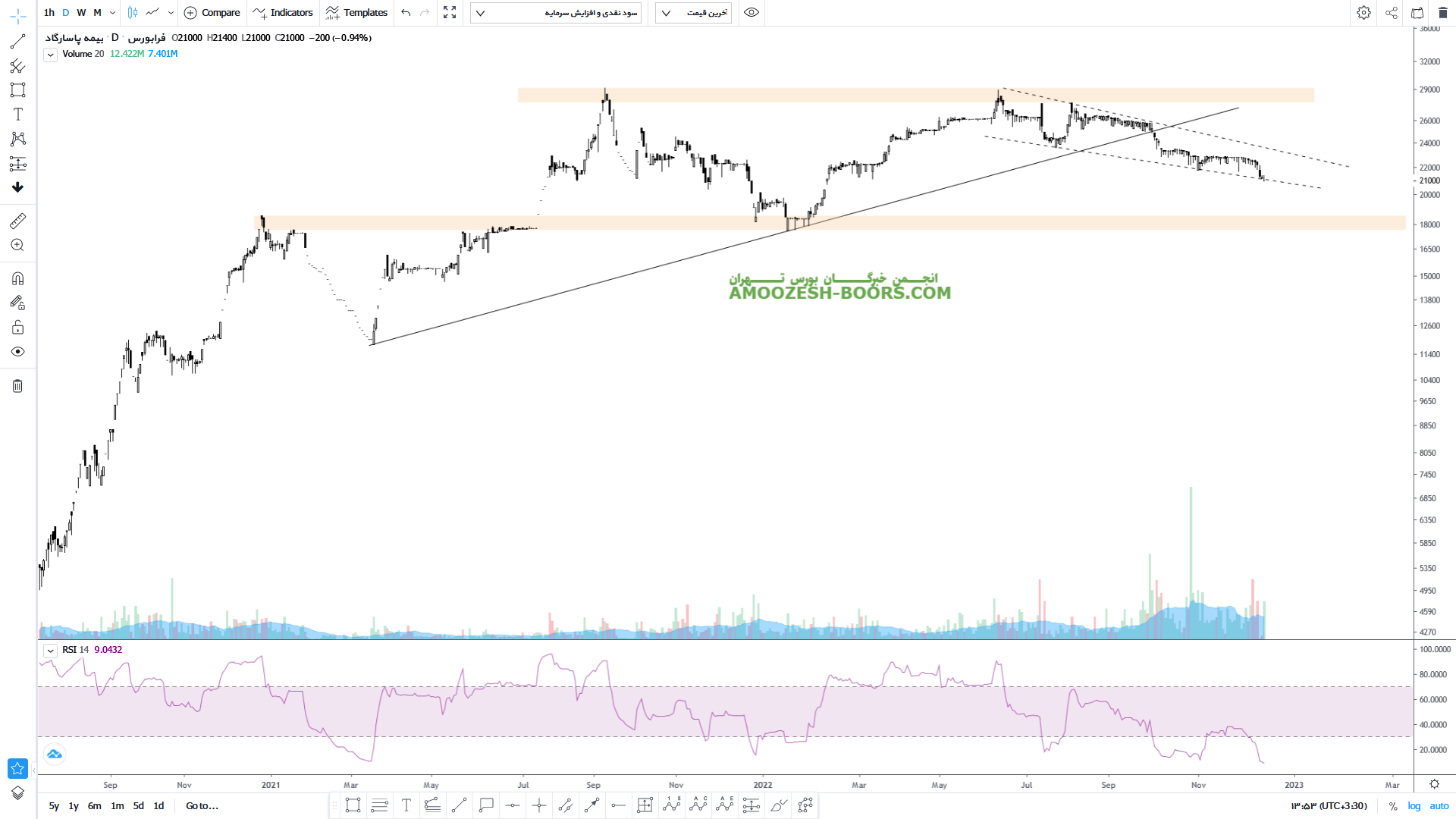 قیمت سهم بپاس پس از شکست خط روند صعودی خود در حال حرکت به سمت حمایت بعدی خود یعنی حمایت ناحیه ۱۸۰۰ تومان می باشد که این حرکت را در قالب یک کانال نزولی در حال اجرا میباشد. در صورتی که قیمت سهم بپاس از کانال نزولی خود خارج بشود میتواند رشد خود را تا مقاومت مهم ناحیه سقف تاریخی ۳۰۰۰ تومان ادامه دهد.