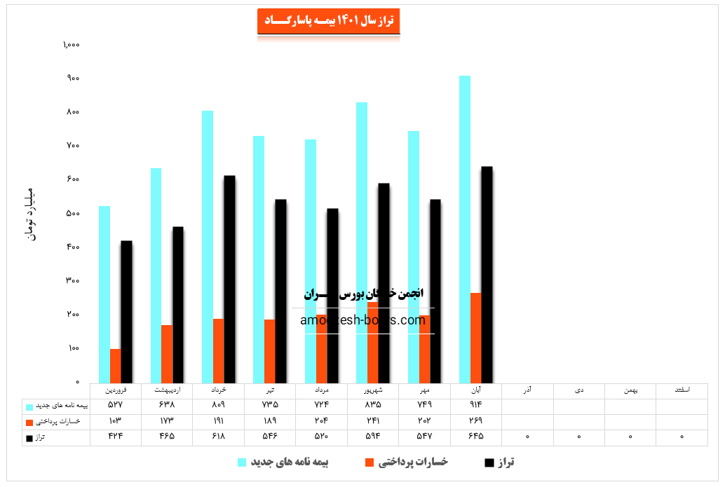 نماد بپاس (شرکت بیمه پاسارگاد) در آبان ماه سال 1401 حدود مبلغ 724 میلیارد تومان بیمه نامه جدید صادر کرده که این میزان در مقایسه با ماه گذشته 1% کاهش پیدا کرده است.