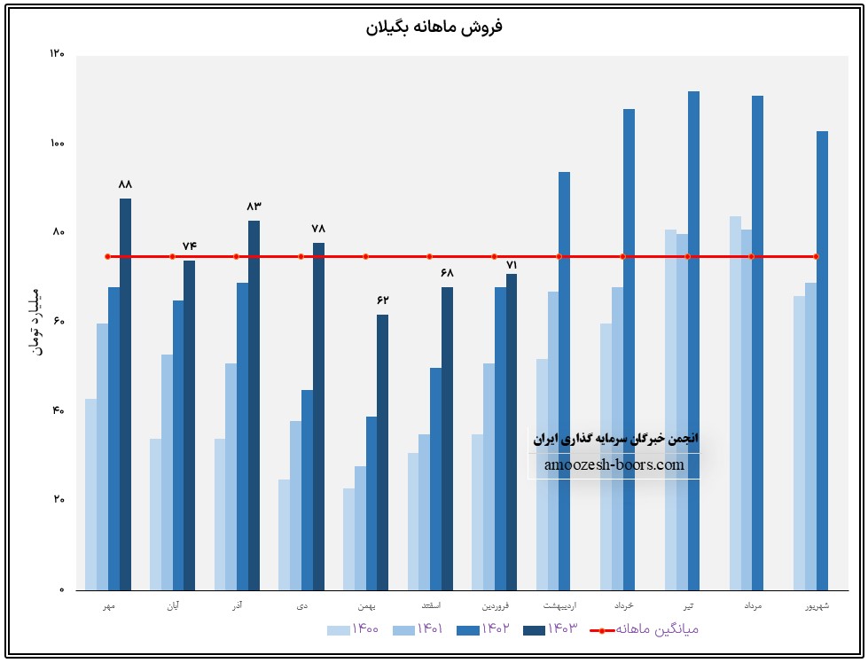 سهم بگیلان (شرکت توسعه مسير برق گيلان) در فروردین ماه سال 1403 موفق به ثبت فروش 71 میلیارد تومانی شده است. لازم به ذکر است که درآمد این ماه نسبت به ماه گذشته رشد 4 درصدی همچنین و نسبت به مدت مشابه سال گذشته رشد 4 درصدی را تجربه کرده است.