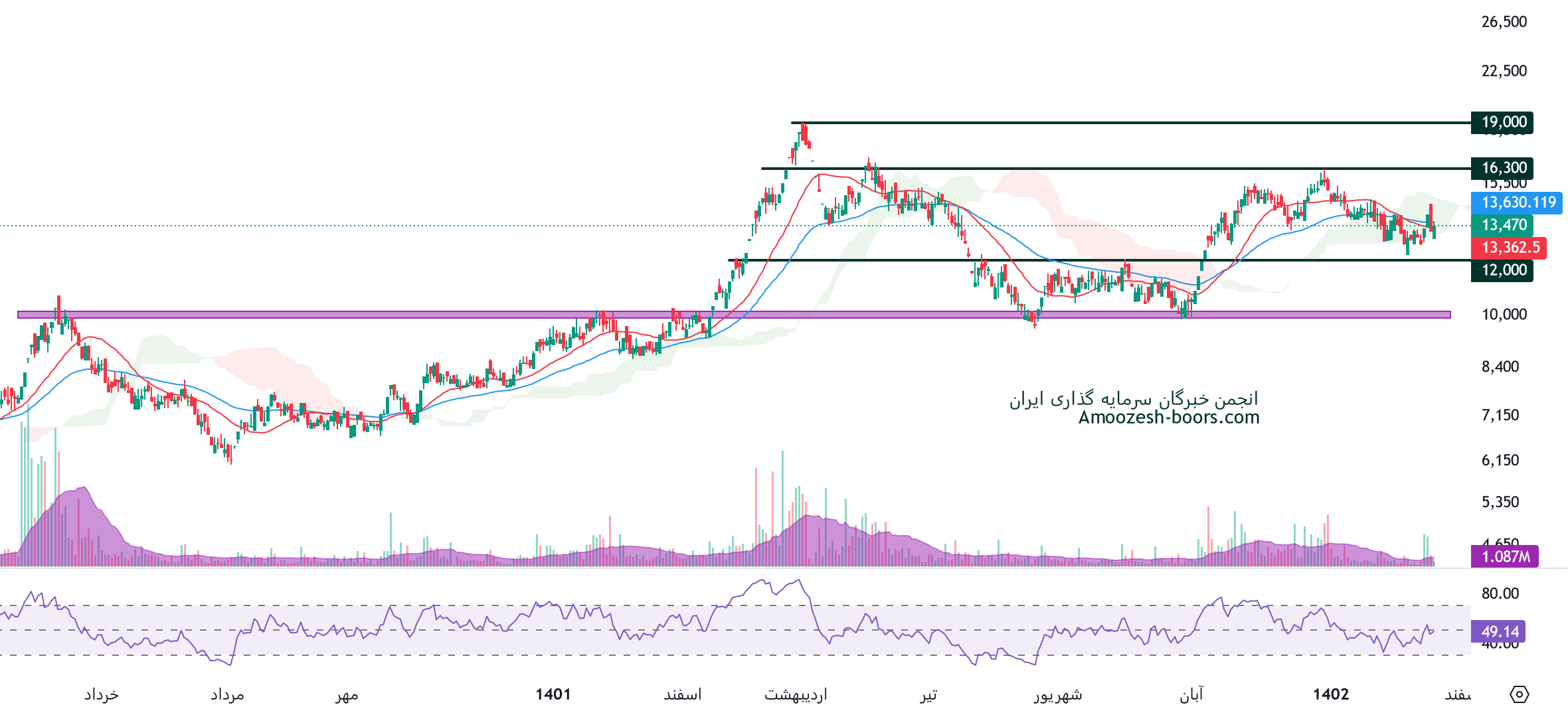 همانطور که در تحلیل تکنیکال تبرک میبینیم قیمت در محدوده حمایتی 12000 ریال و محدوده مقاومتی 16300 ریال در حال نوسان میباشد.