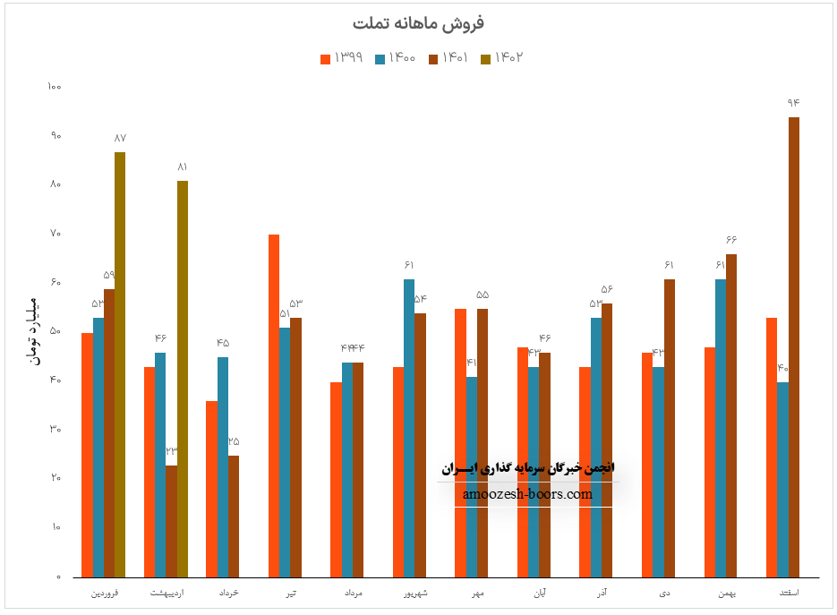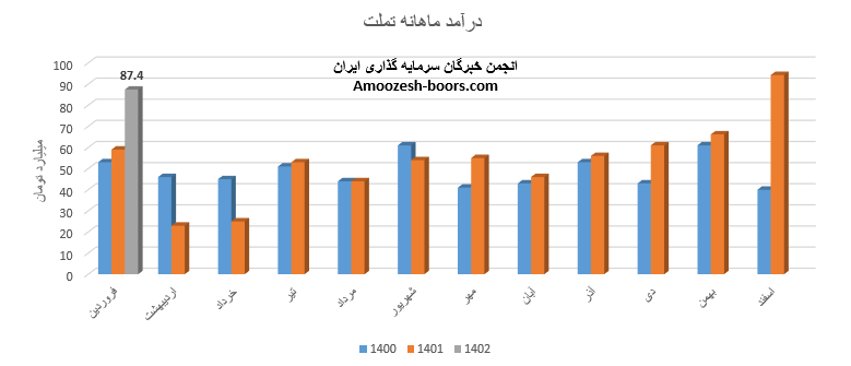 نماد تملت با افت جزئی 7 درصدی نسبت به ماه گذشته به درآمد 87.4 میلیارد تومان دست یافته است که با توجه به تعطیلات نیمه ابتدایی سال گزارش مطلوبی میباشد چرا که نسبت به مدت مشابه 47% بهبود عملکرد داشته است، باید در نظر داشت سهم تملت در مرحله برگزاری مجمع عمومی جهت تصویب افزایش سرمایه 25 درصدی از سود انباشته بوده و به سهامدارنی که در مجمع تملت مشارکت نموده اند 33 ریال سود تخصیص داده شده است.