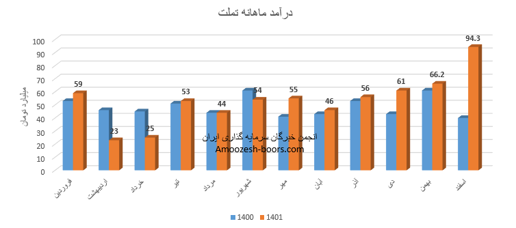 نماد تملت با رشد خیره کننده 91 درصدی درآمد نسبت به متوسط ماهانه به رقم 94.3 میلیارد تومان دست یافته است، همچنین این رقم نسبت به ماه گذشته 42% و نسبت به مدت مشابه نیز 136% بیشتر است، درآمد بازار گردانی، که سهم 51 درصدی از درآمد این ماه را به خود اختصاص داده بود نسبت به ماه قبل افزایش 7 درصدی داشته است، مجموع درآمد 12 ماهه سهم تملت نسبت به سال قبل رشد 10 درصدی را تجربه نموده است.