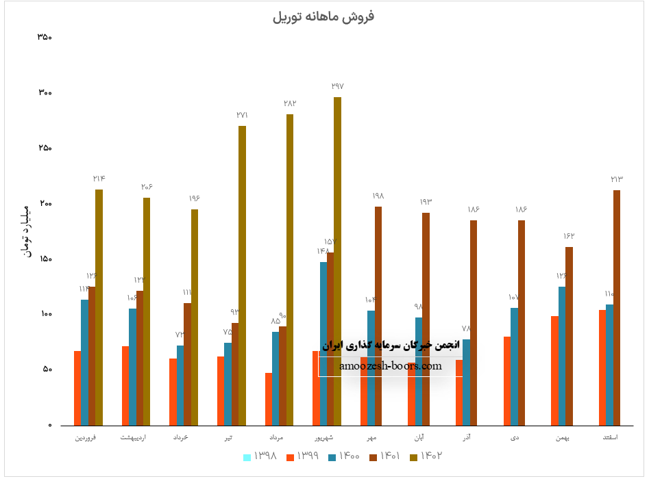 وضعیت نماد توریل در گزارش عملکرد ماهانه 258.6 میلیارد تومان درآمد را نشان میدهد، فروش ماهانه سهم توریل در مقایسه با ماه گذشته افت 13 درصدی داشته اما نسبت به متوسط ماهانه 6% و مهر ماه سال گذشته 30% رشد داشته است.